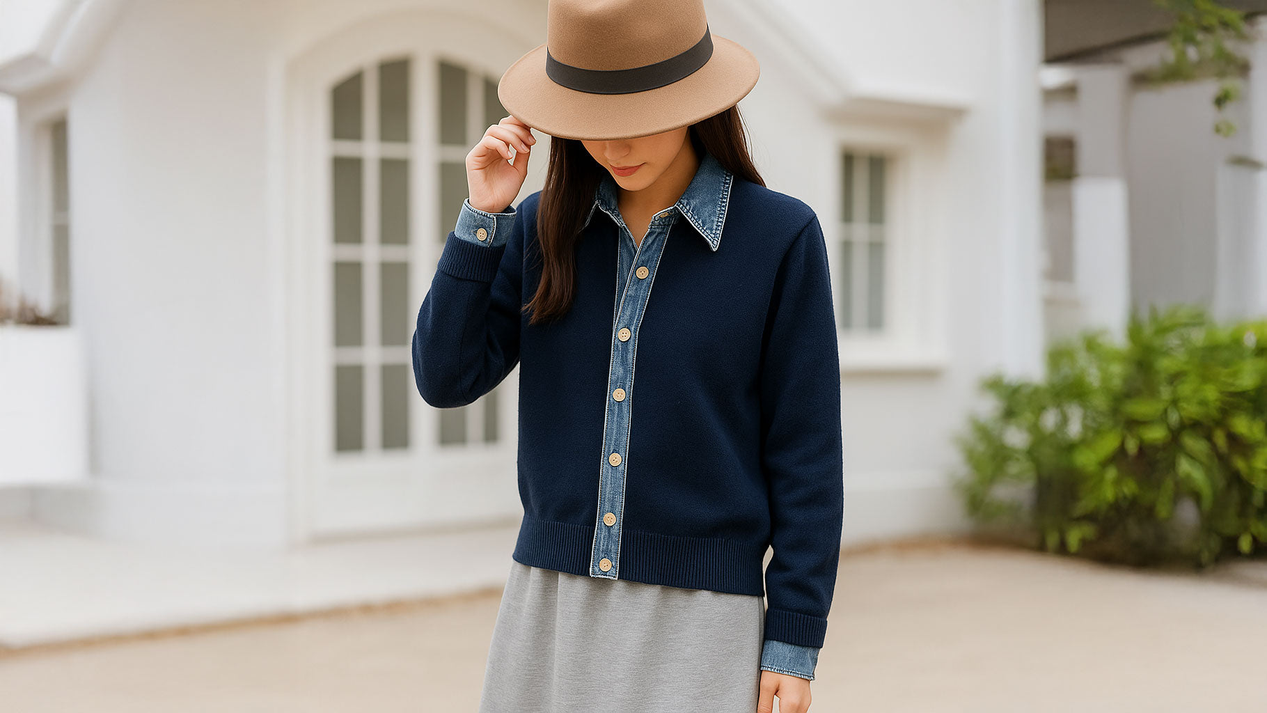 【M〜L】デニム衿コンビニットプルオーバーカーディガン|異素材ミックス・大人カジュアル・着回し万能|N22-221A