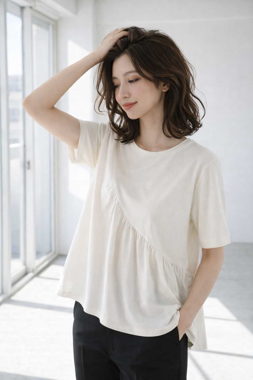 1枚で決まる洗練シルエット。大人の「アシンメトリー フレア Tシャツ」