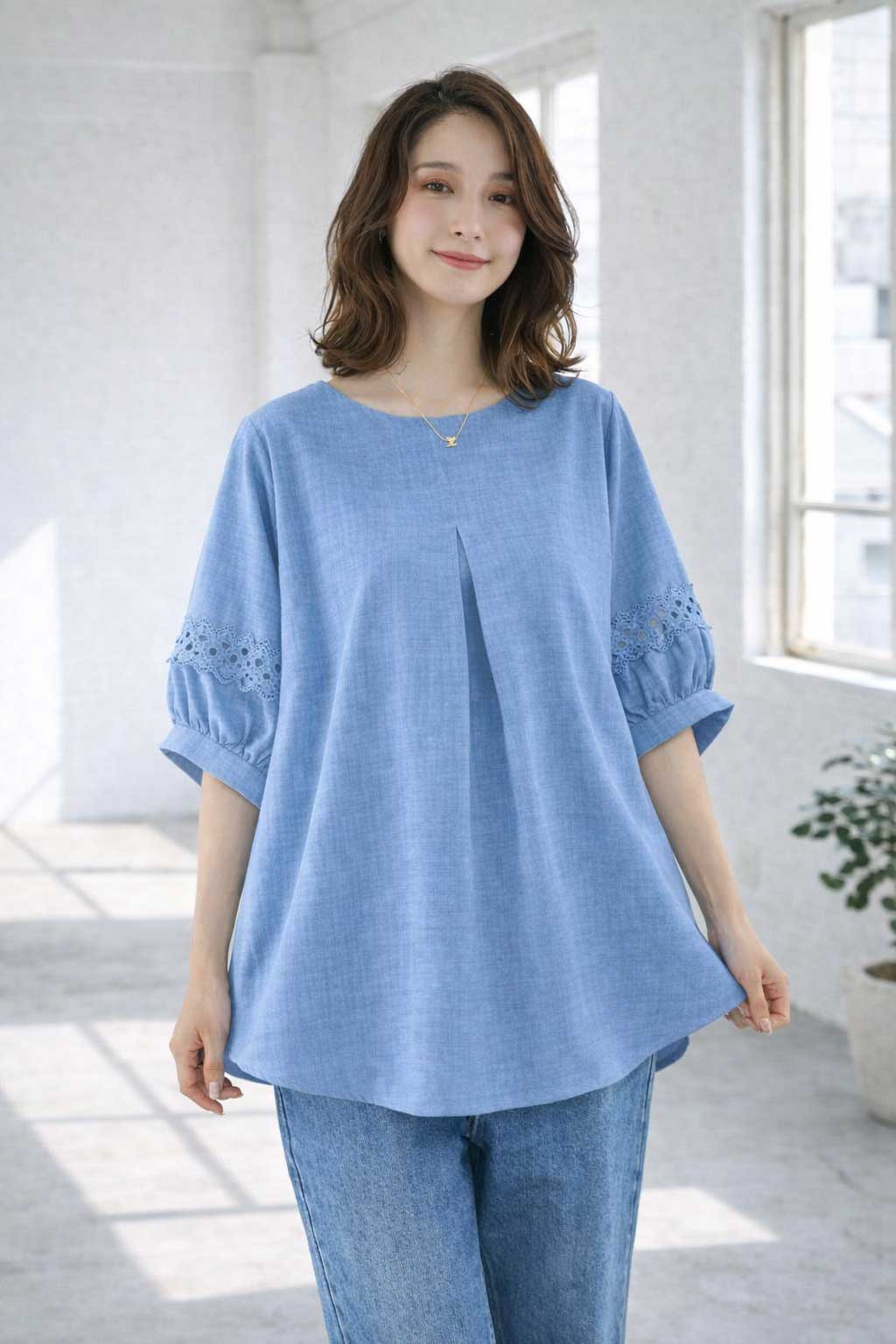 レース袖 シャツ チュニック M ギャザー Aライン ゆったり 体型カバー