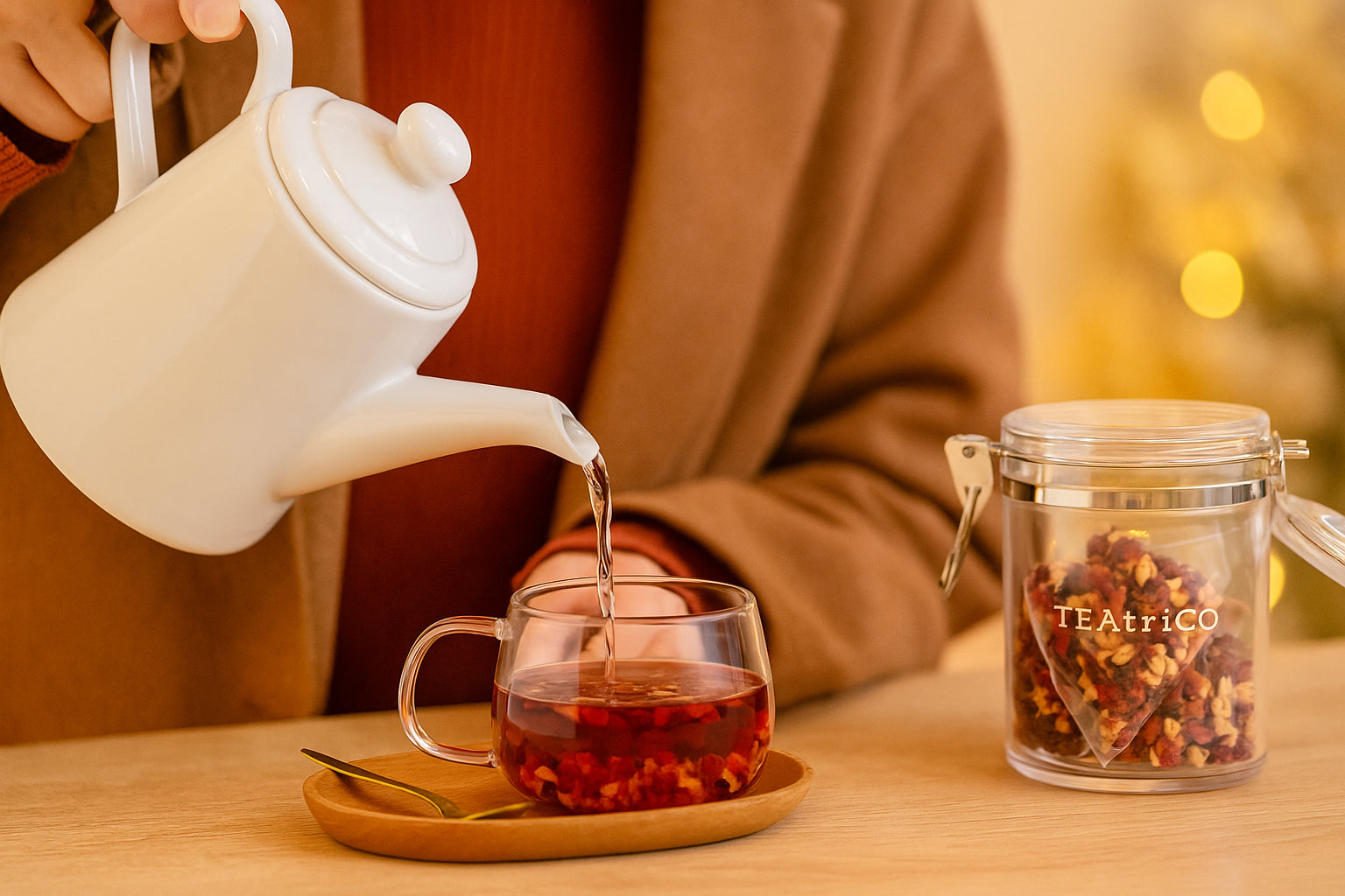 「味」「香り」「彩」を五感で楽しむ食べられるフルーツティー。ドライフルーツとハーブの個性豊かなブレンドが特別な"ひととき"へと誘います。