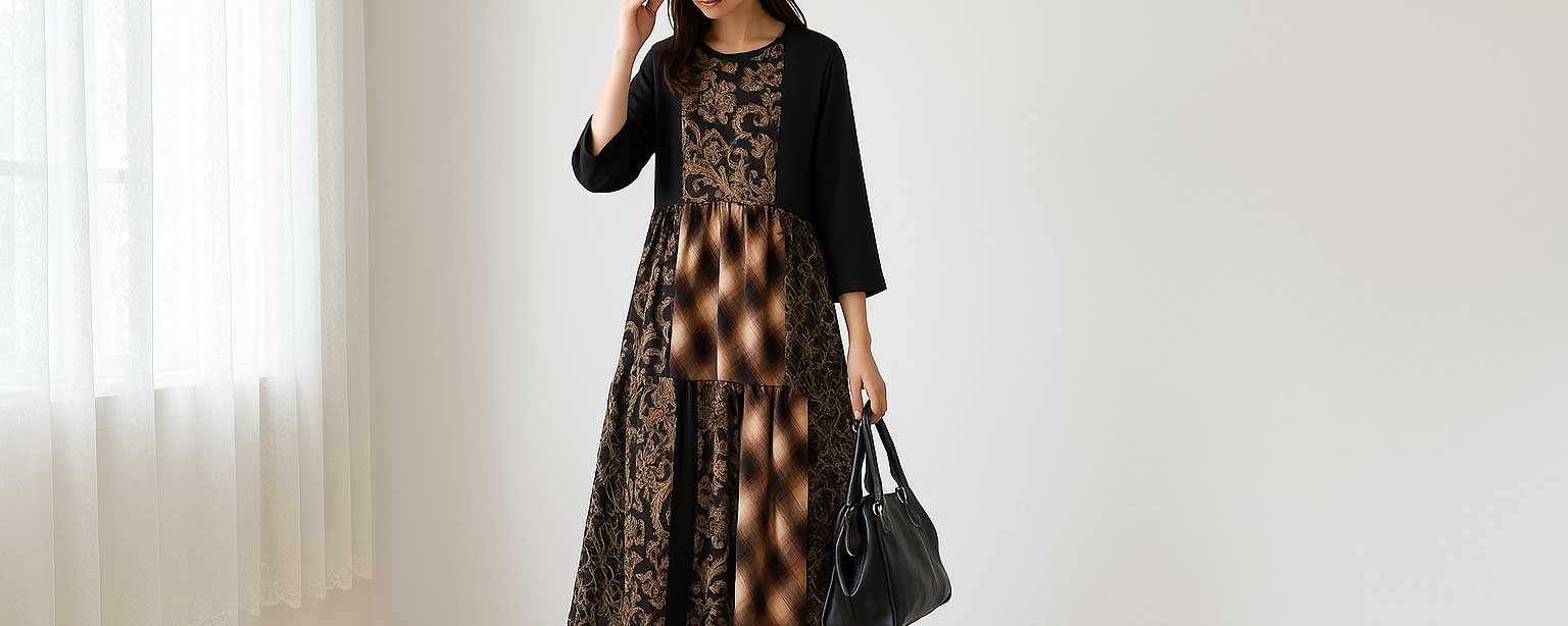【M~L相当】袖異素材切替ワンピース|長袖・体型カバー・秋冬ワンピース・C-3144