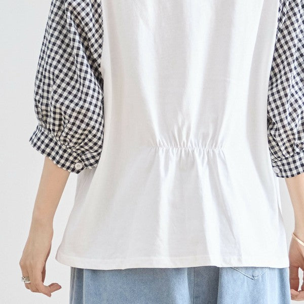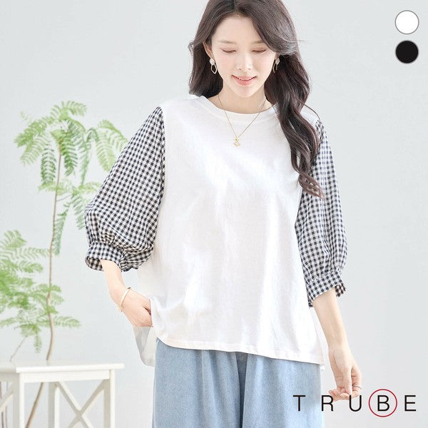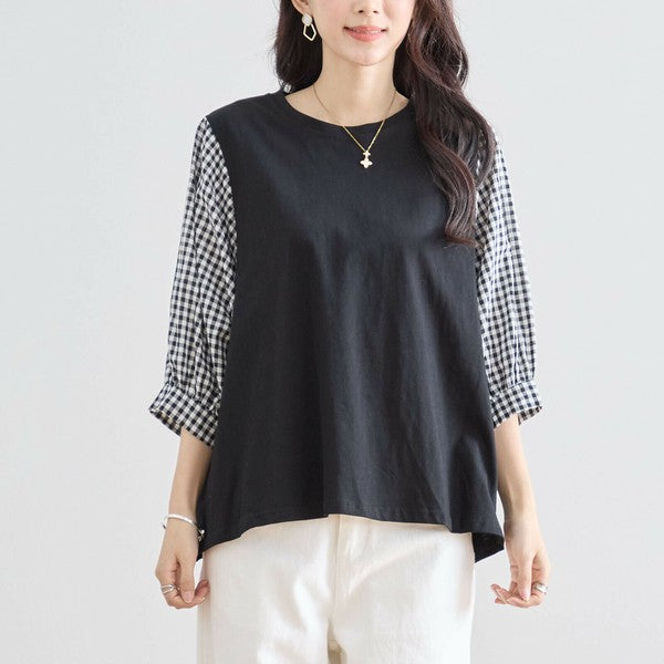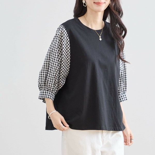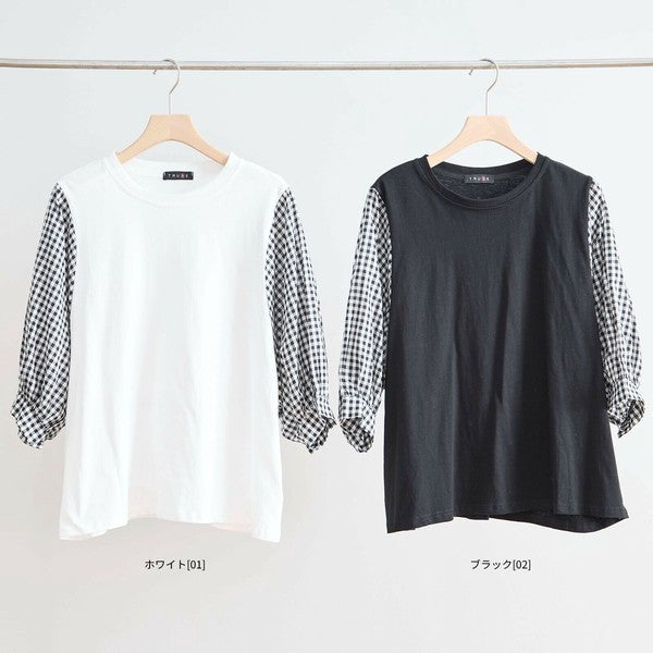 トップス L〜LL 大きいサイズ ギンガム袖切替 コットン プルオーバー レディース 五分袖/N12-504