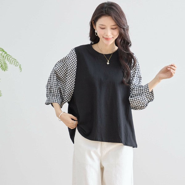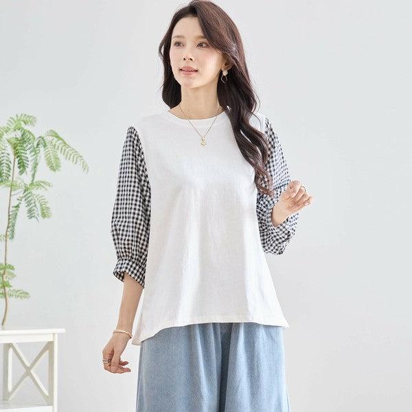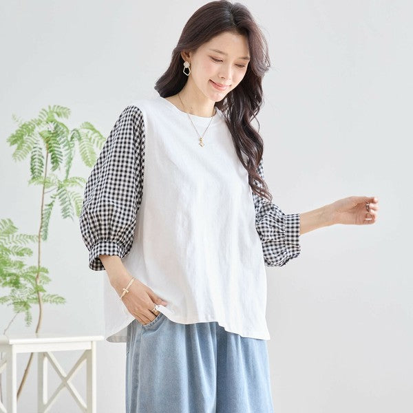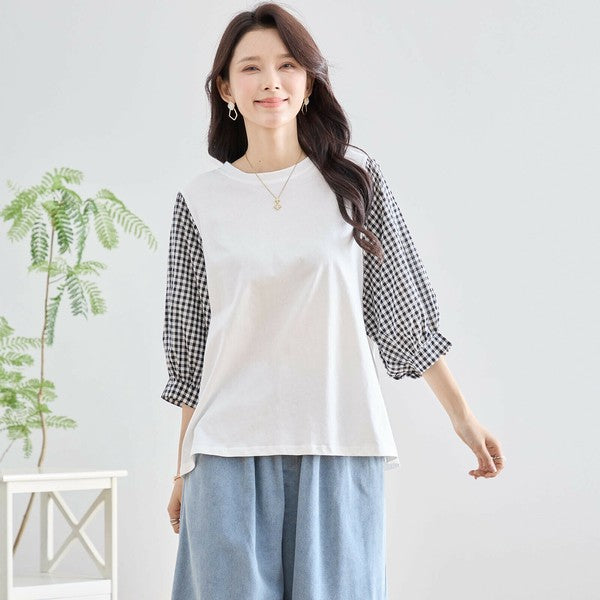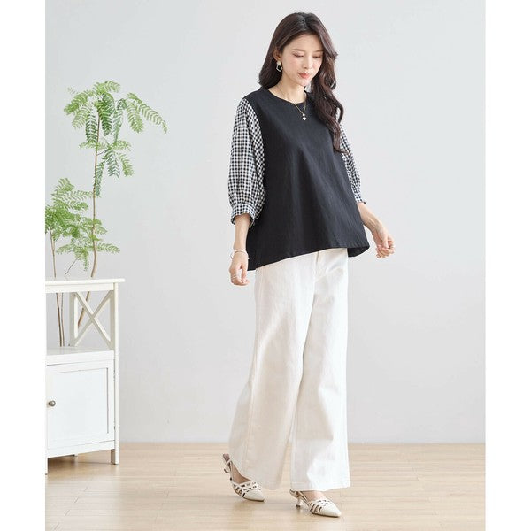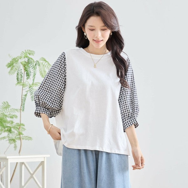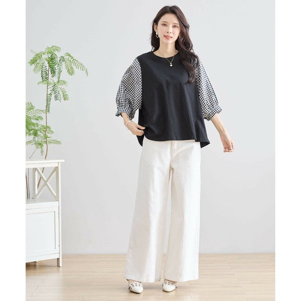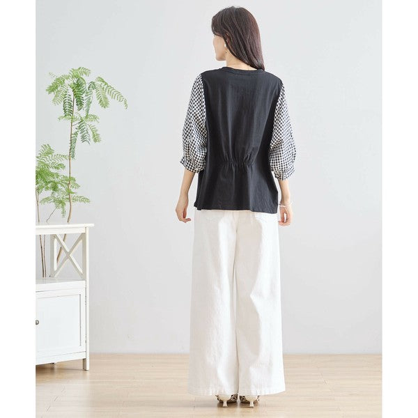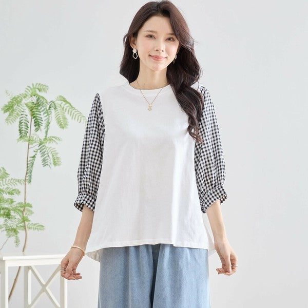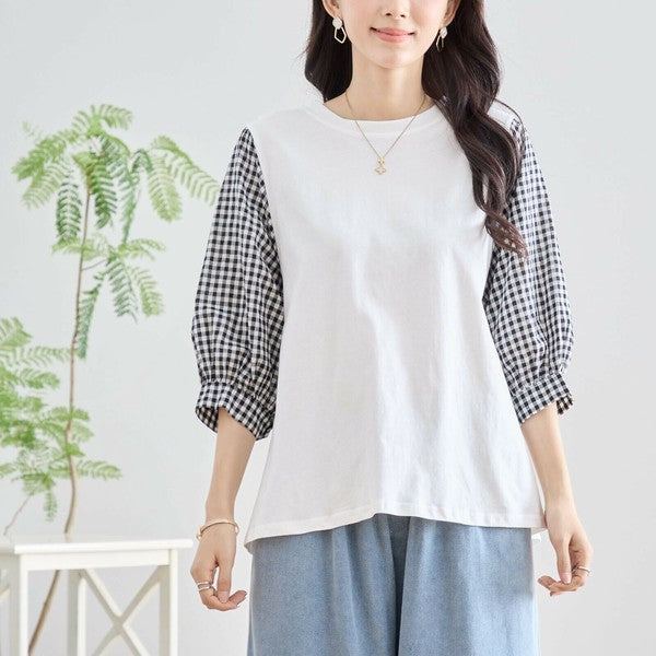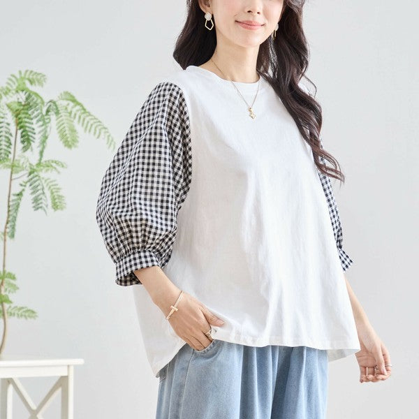 ・袖にふんわりとしたギンガムチェックの異素材を切り替えた、程よく甘さをプラスした大人カジュアルなプルオーバー。