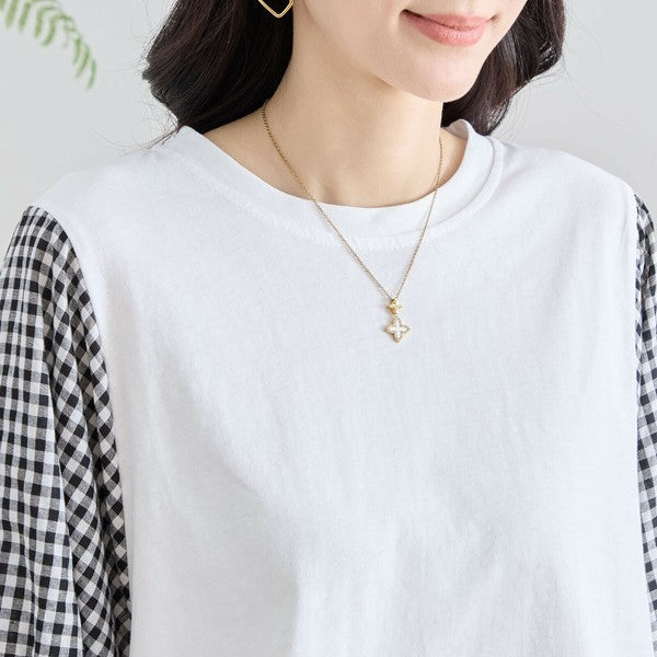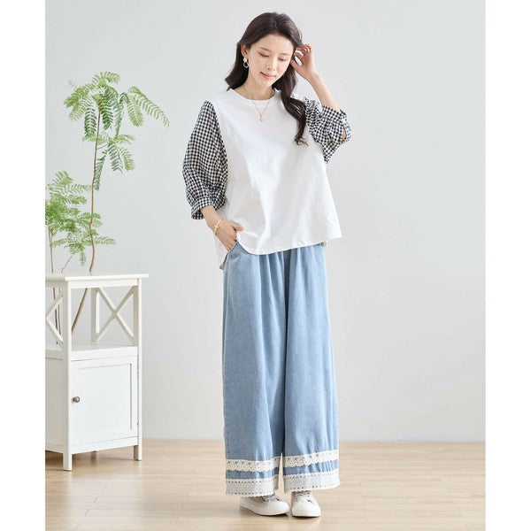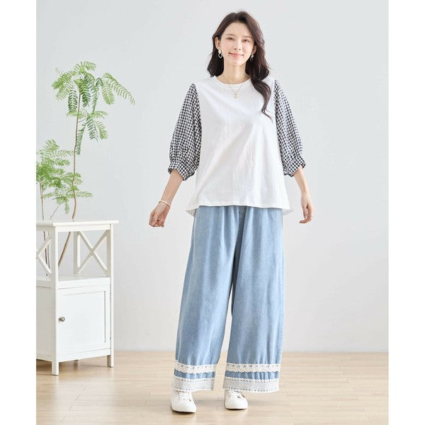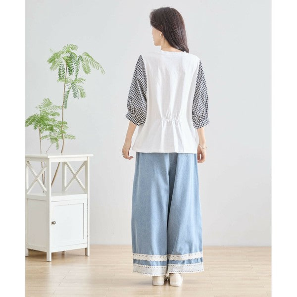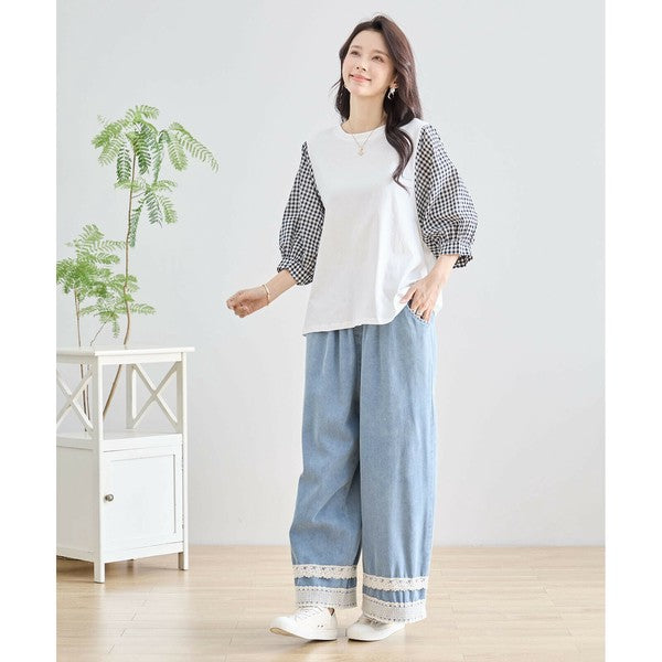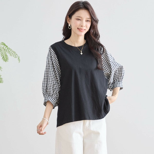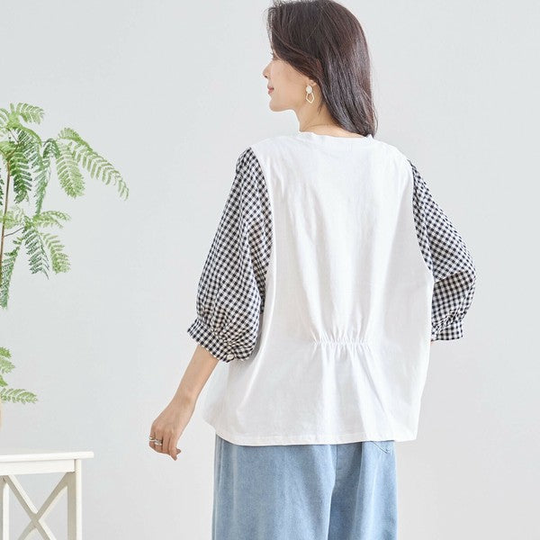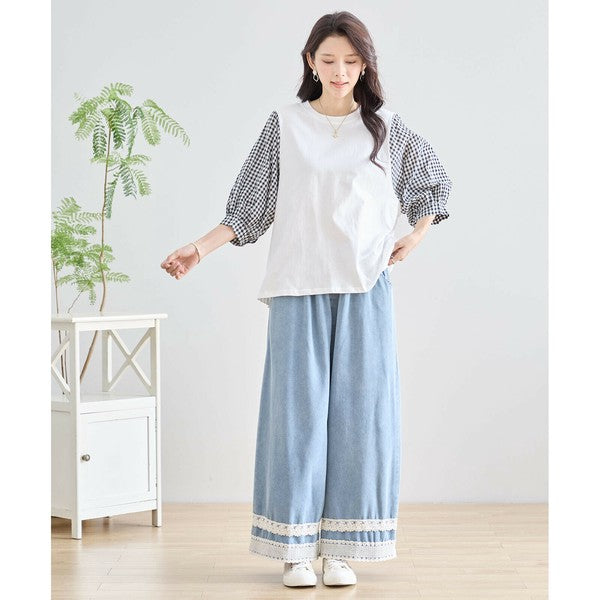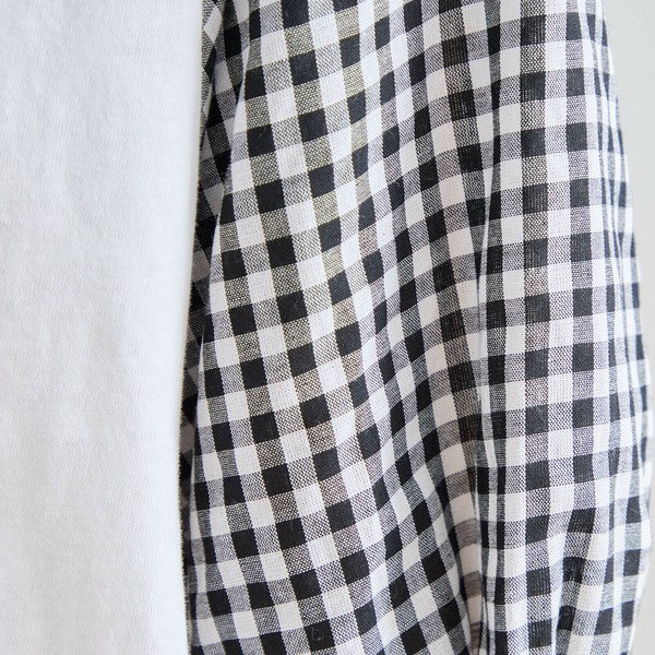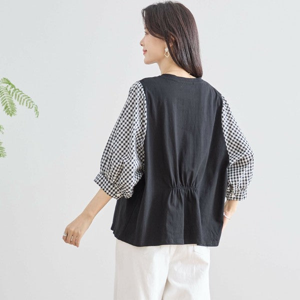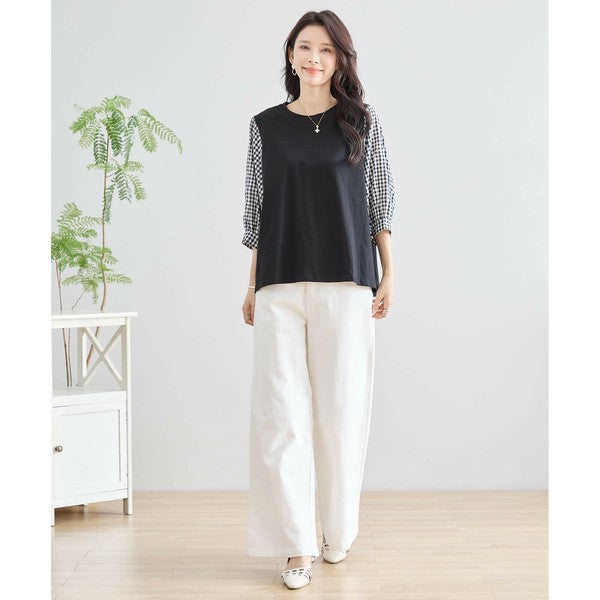 ・袖にふんわりとしたギンガムチェックの異素材を切り替えた、程よく甘さをプラスした大人カジュアルなプルオーバー。