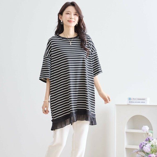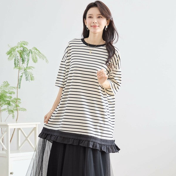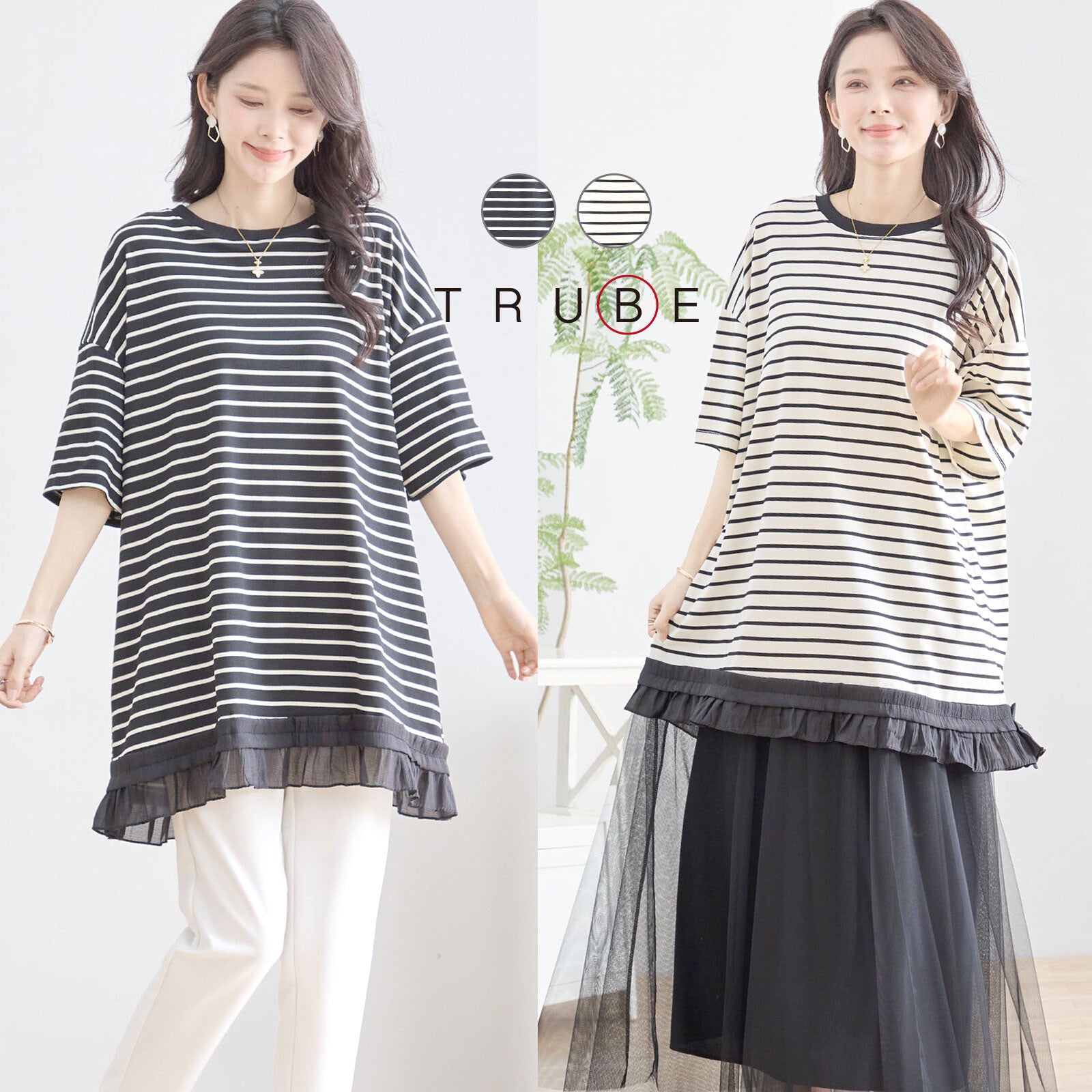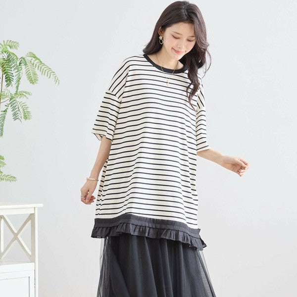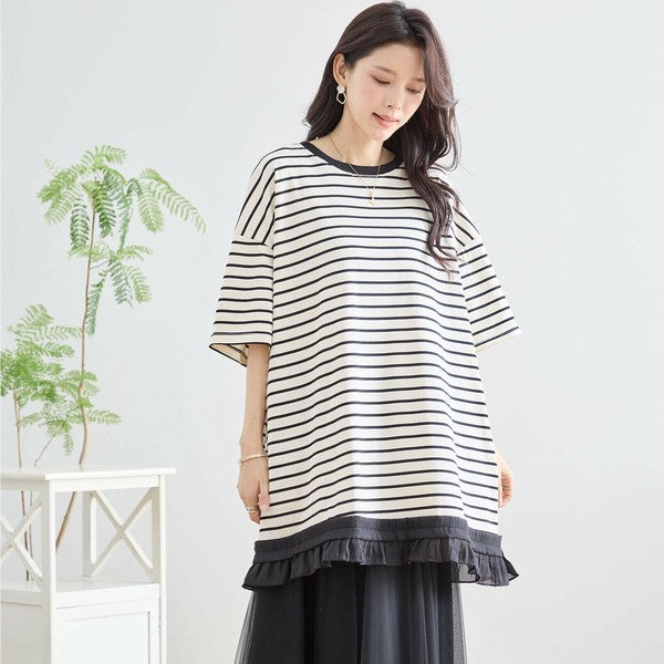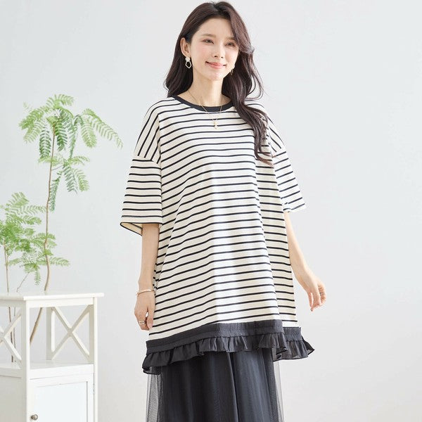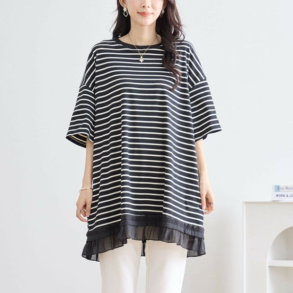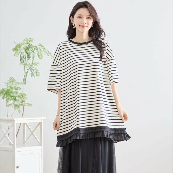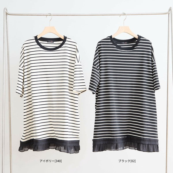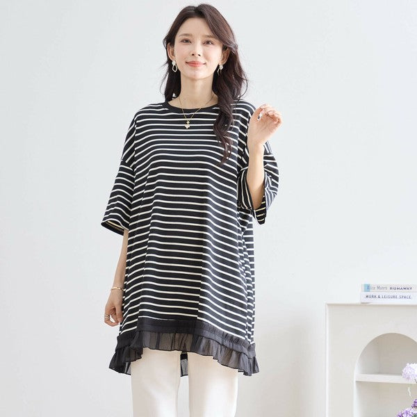 【L〜LL】裾フリル付きボーダーチュニック 半袖 ゆったりカットソー コットン混