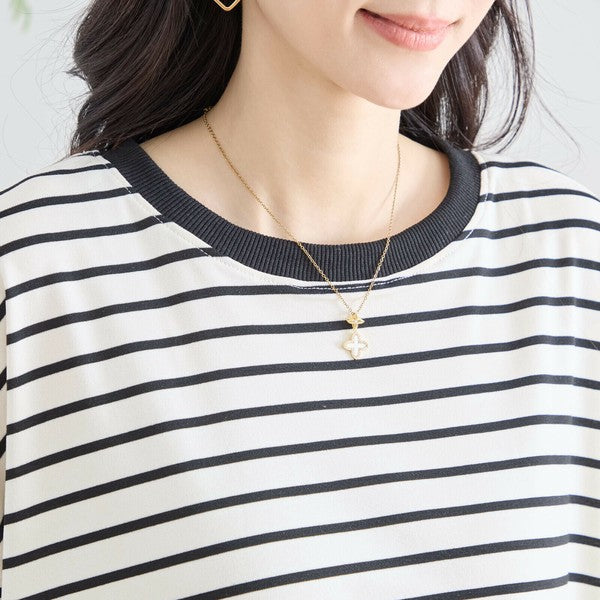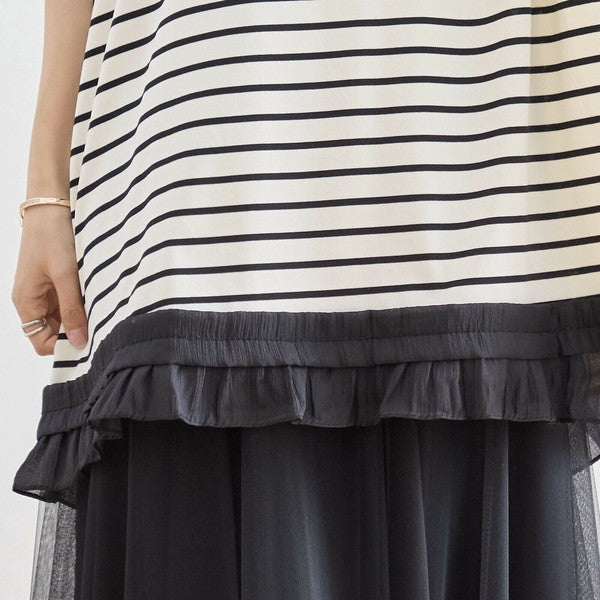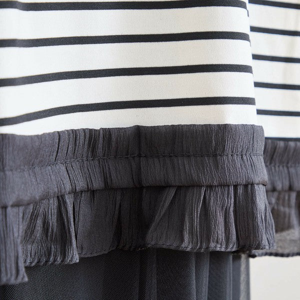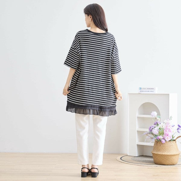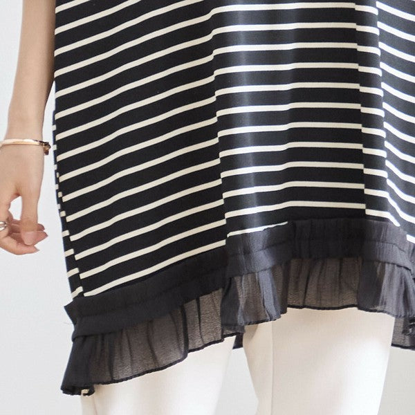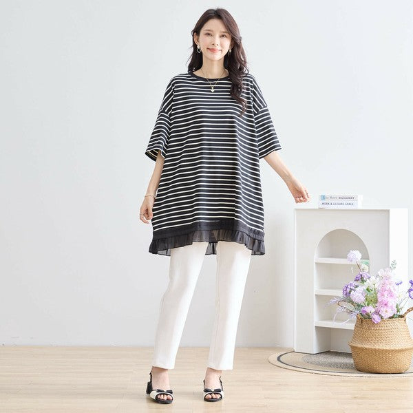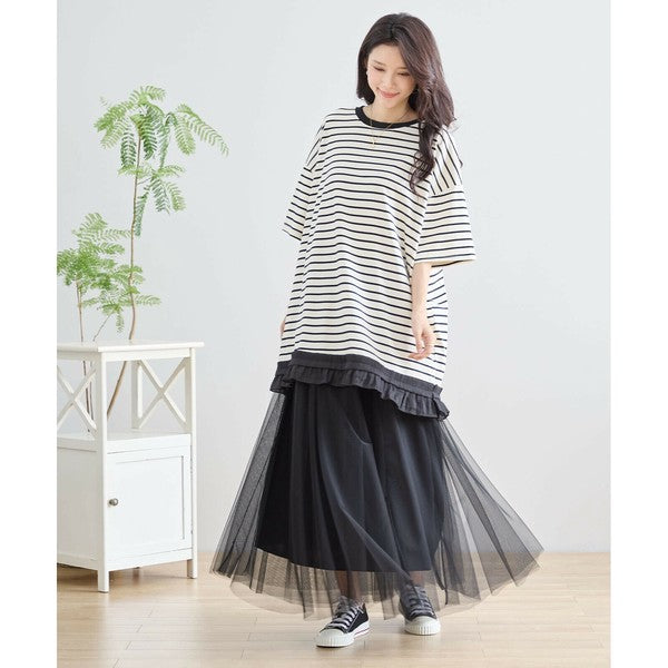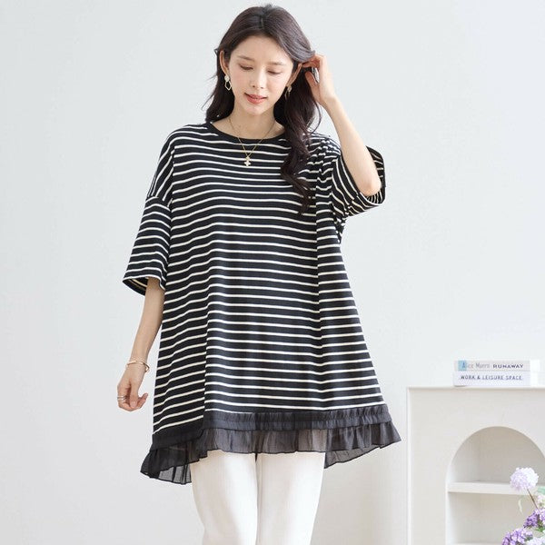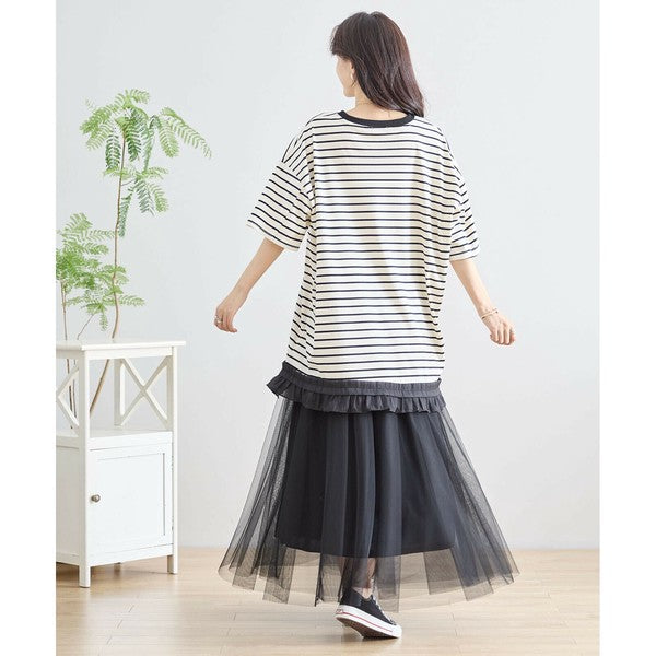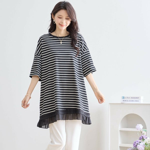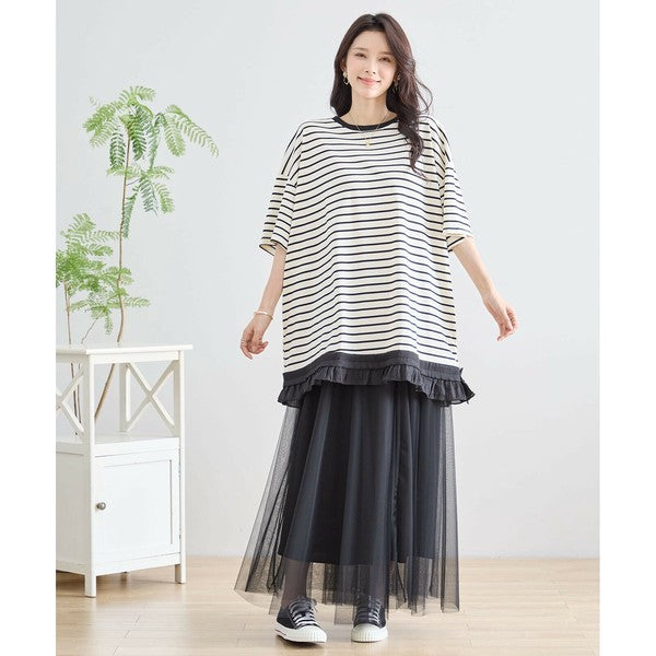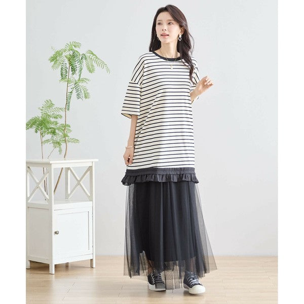【L〜LL】裾フリル付きボーダーチュニック 半袖 ゆったりカットソー コットン混