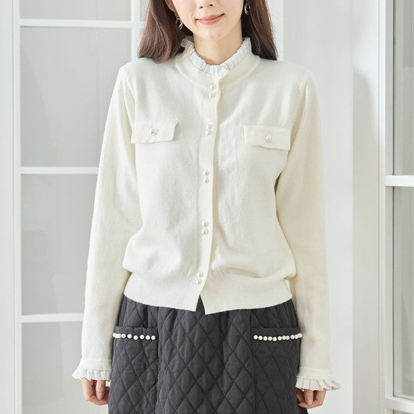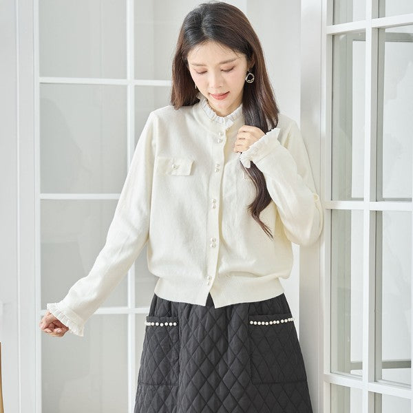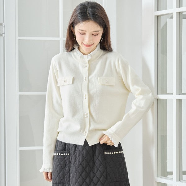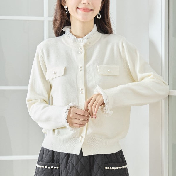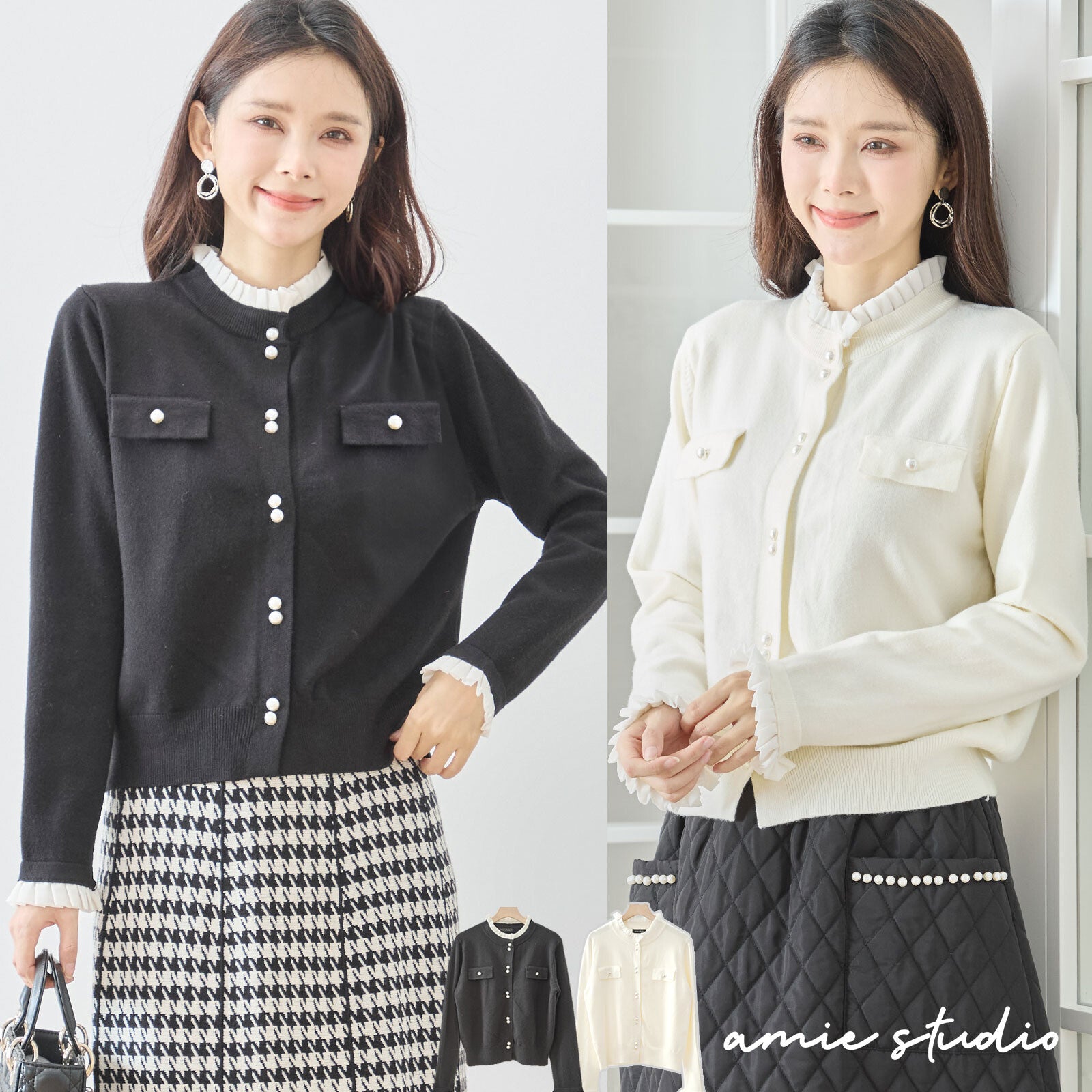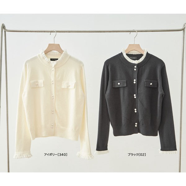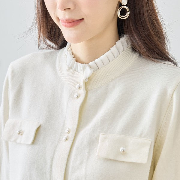 【M〜L】フリルネックパール釦ニットカーディガン|amie studio