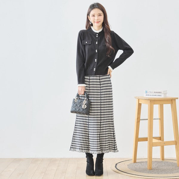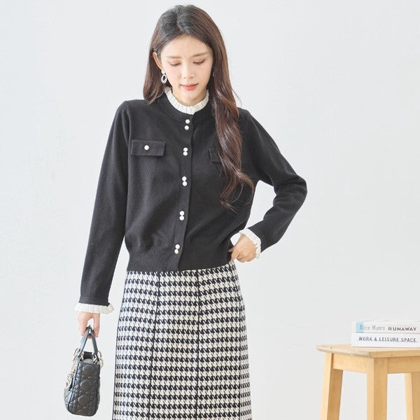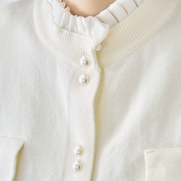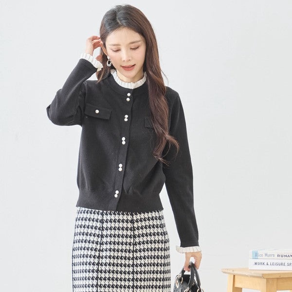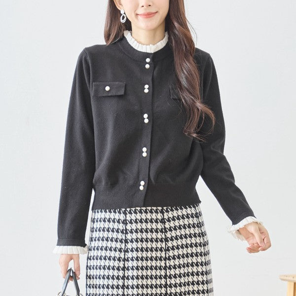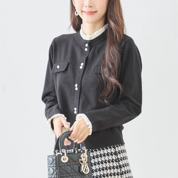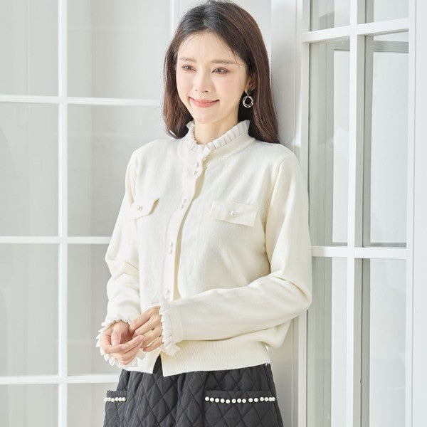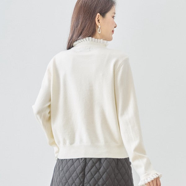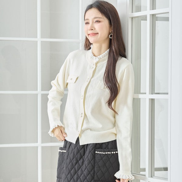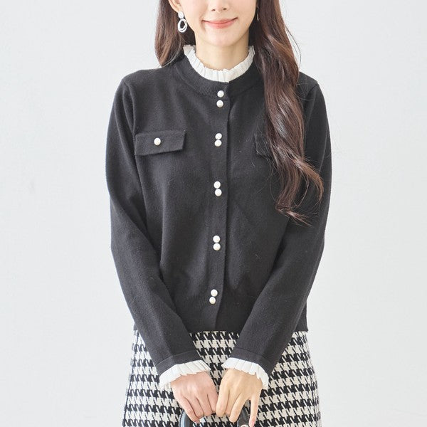 【M〜L】フリルネックパール釦ニットカーディガン|amie studio
