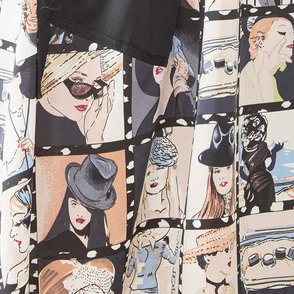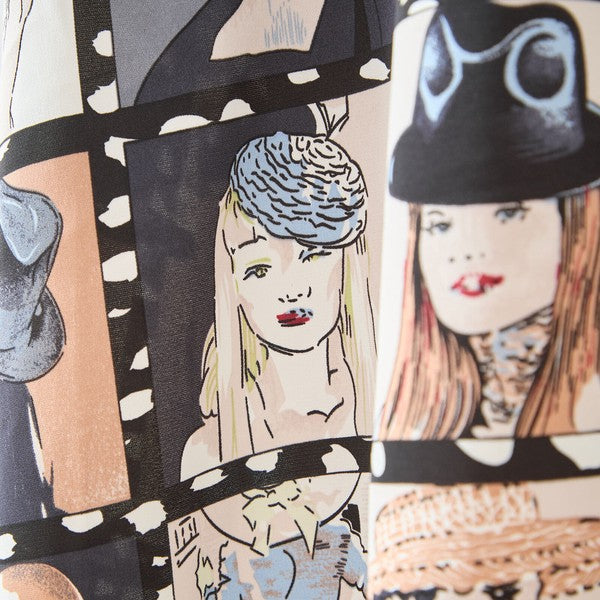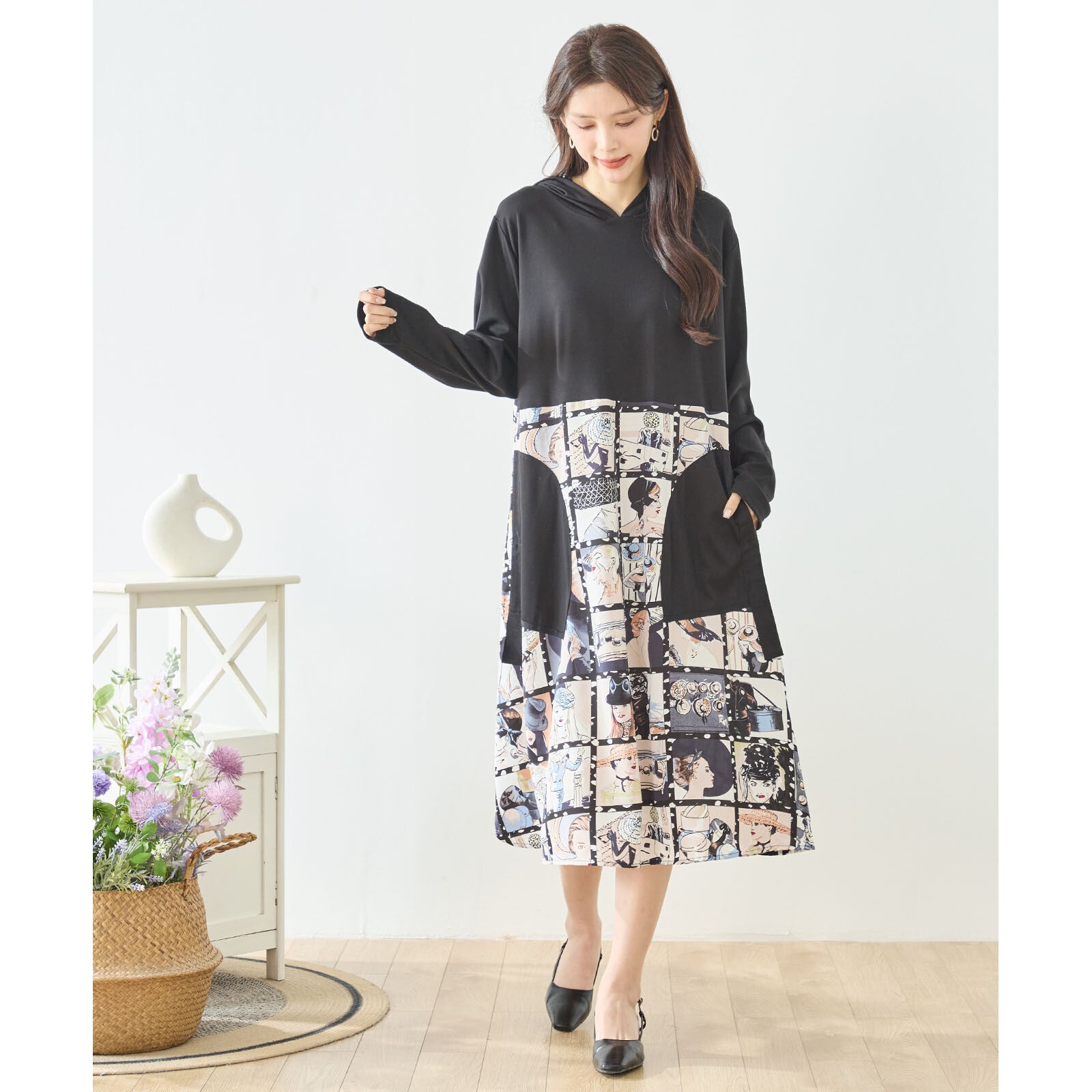 上半身はカジュアルな無地のフーディ(フード付き)デザイン。 スカート部分には、レトロなポートレートやフィルムをコラージュしたような「アートパネル柄」を大胆にドッキングしました。 相反するテイストが絶妙にマッチし、着るだけで存在感のあるスタイリングが完成します。