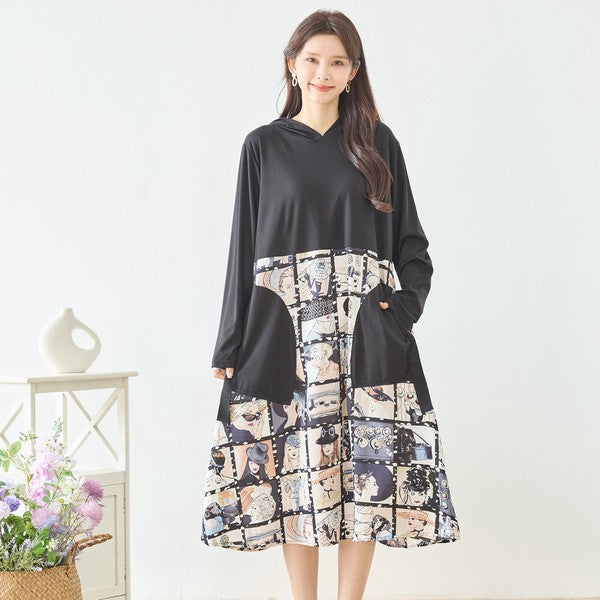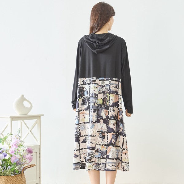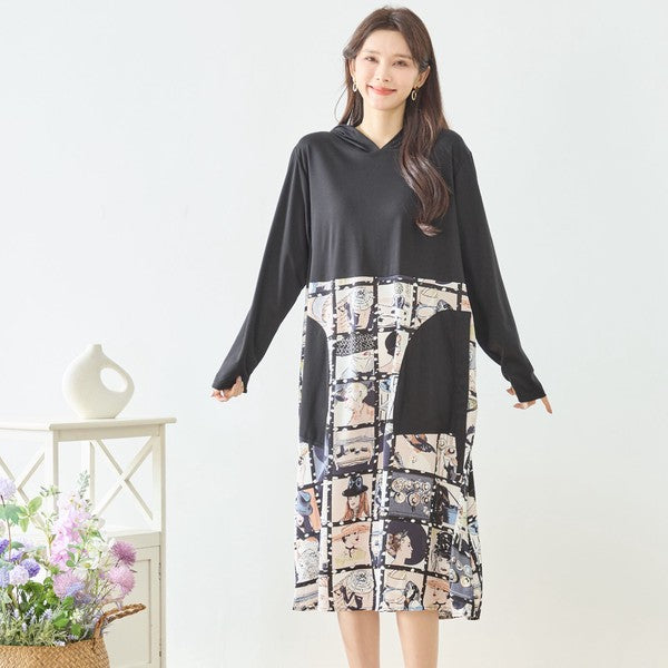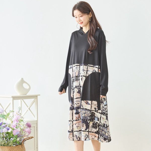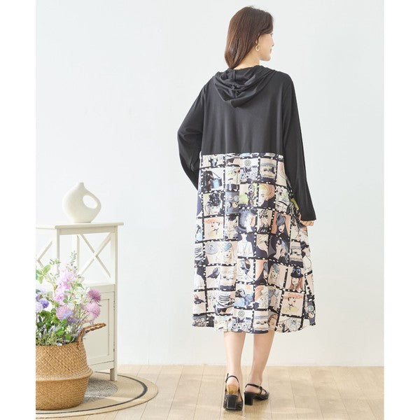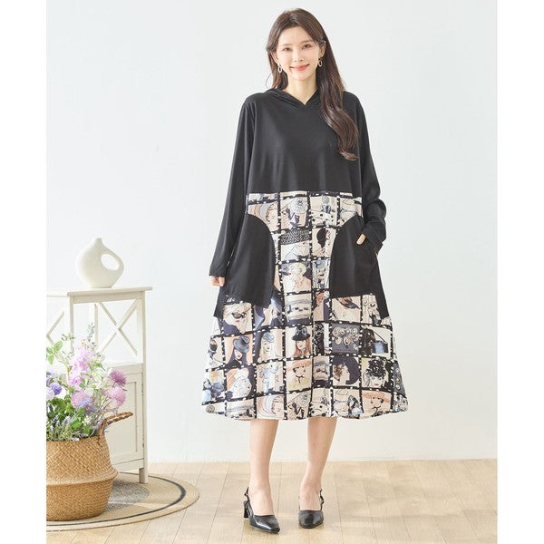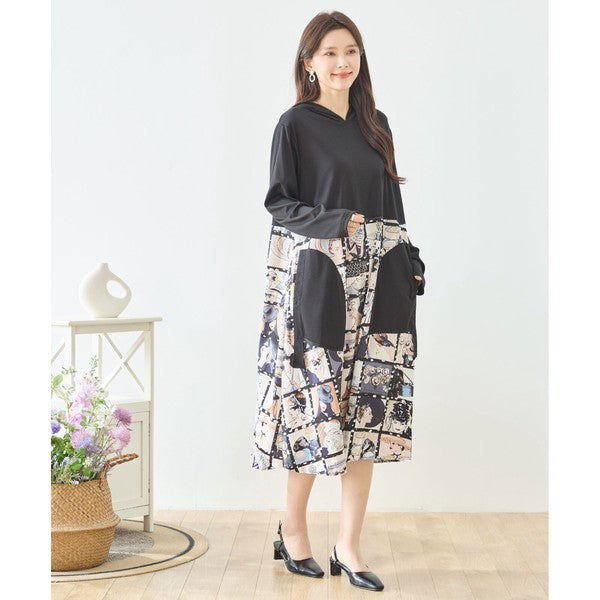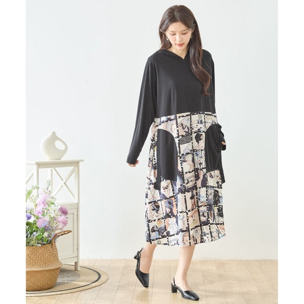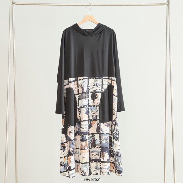 アートパネル切替 フーディワンピース 長袖 異素材 ドッキング ロング丈 ゆったり