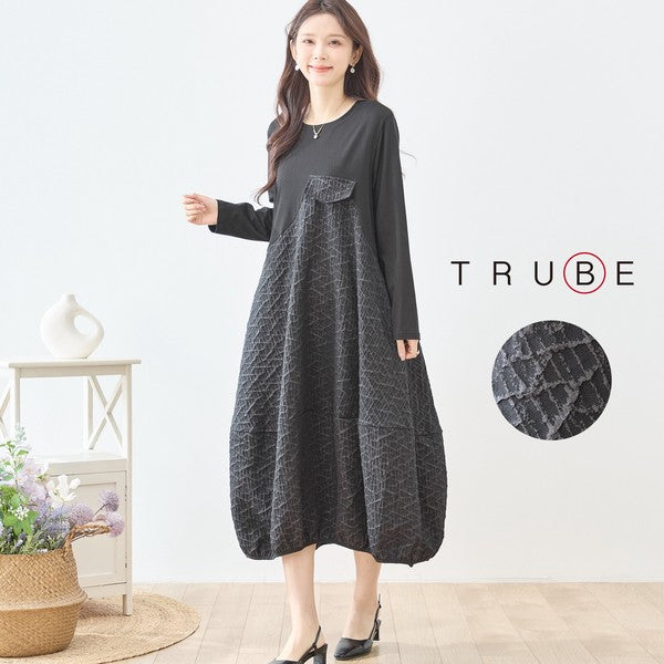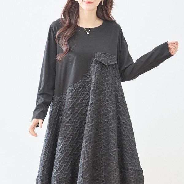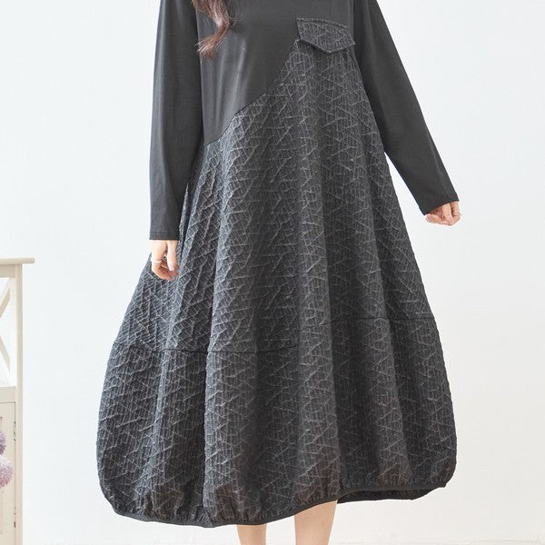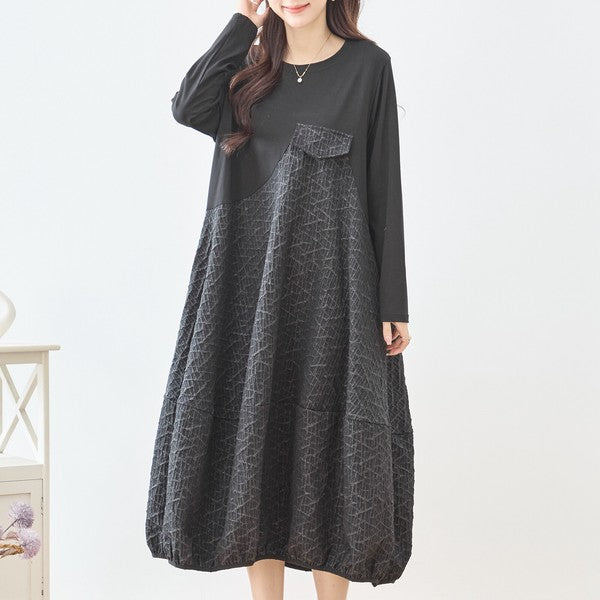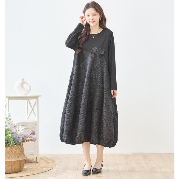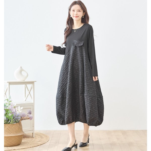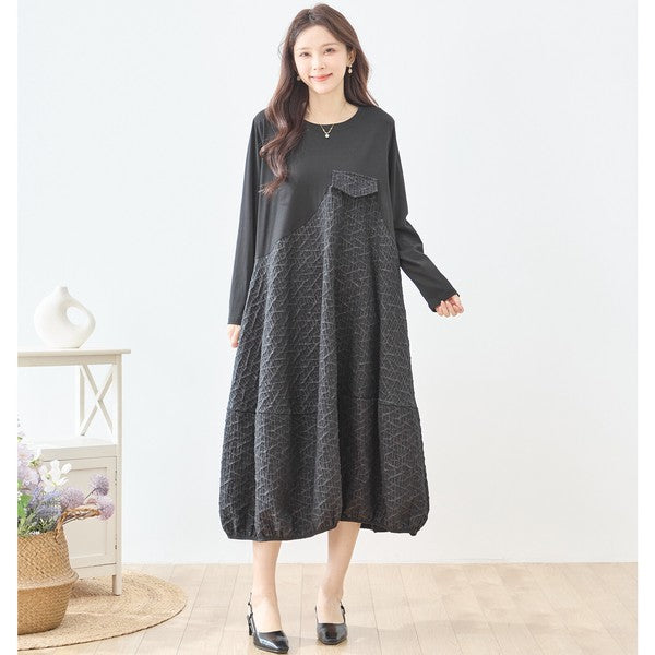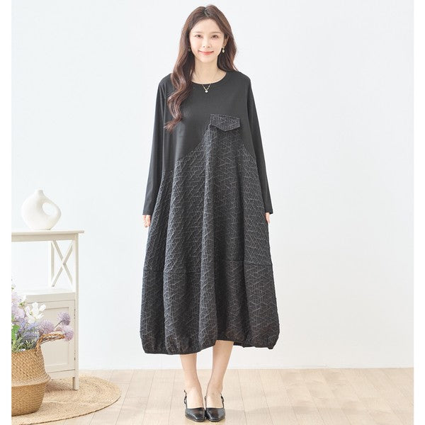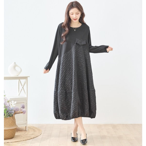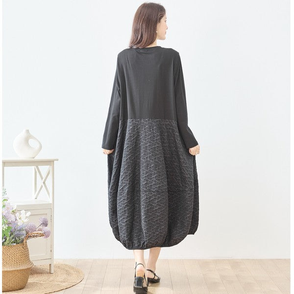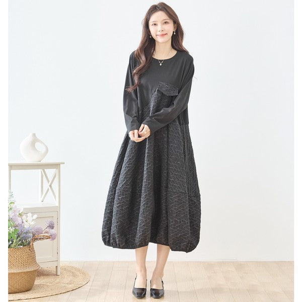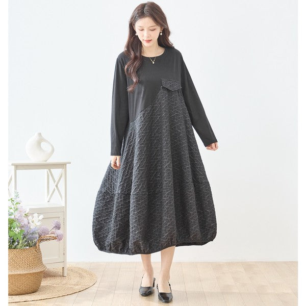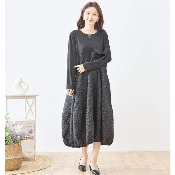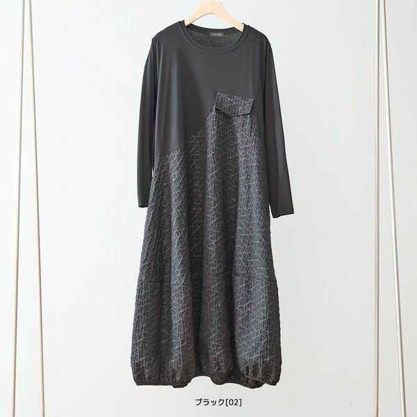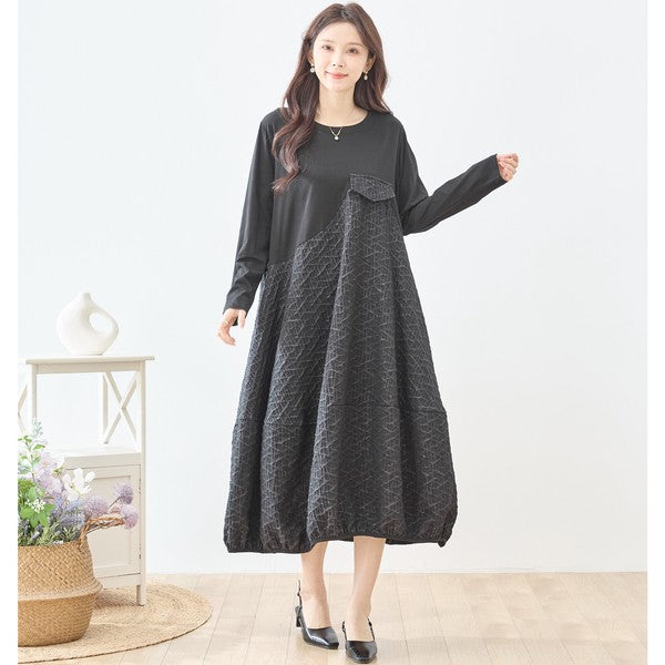 異素材切り替え バルーン ロングワンピース 幾何学ジャガード風 アシンメトリー 長袖 ゆったり L〜LL 体型カバー