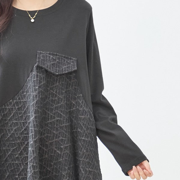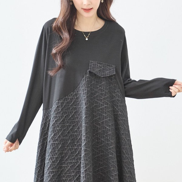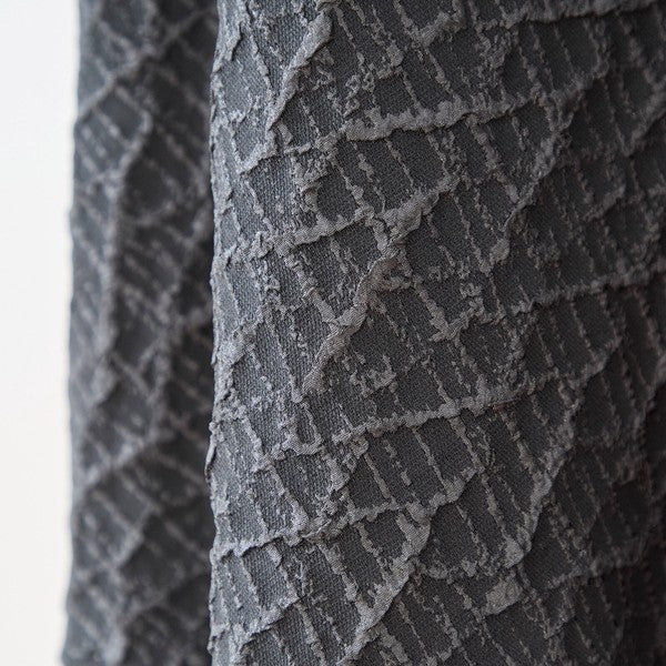 ブラックのワントーンでありながら、斜めに入った大胆なアシンメトリー切り替えが視線を惹きつけるモードなデザイン。 上部は着心地の良いカットソー素材、下部は立体的な幾何学(格子)模様のジャガード風(ふくれ織り風)素材を組み合わせることで、のっぺりせず奥行きのあるスタイリッシュなスタイルが完成します。