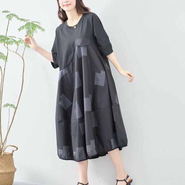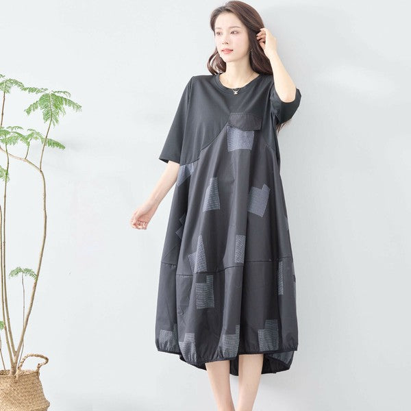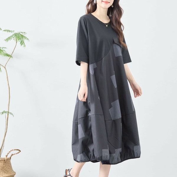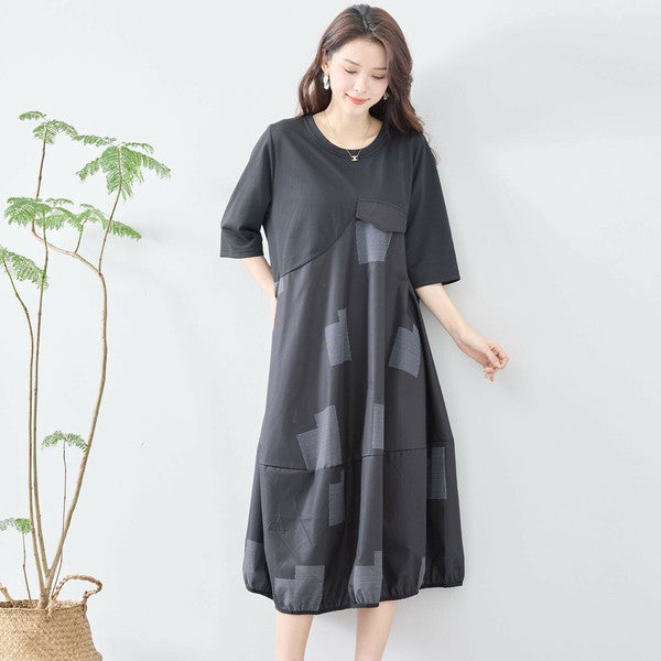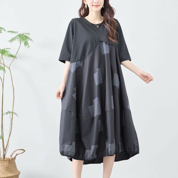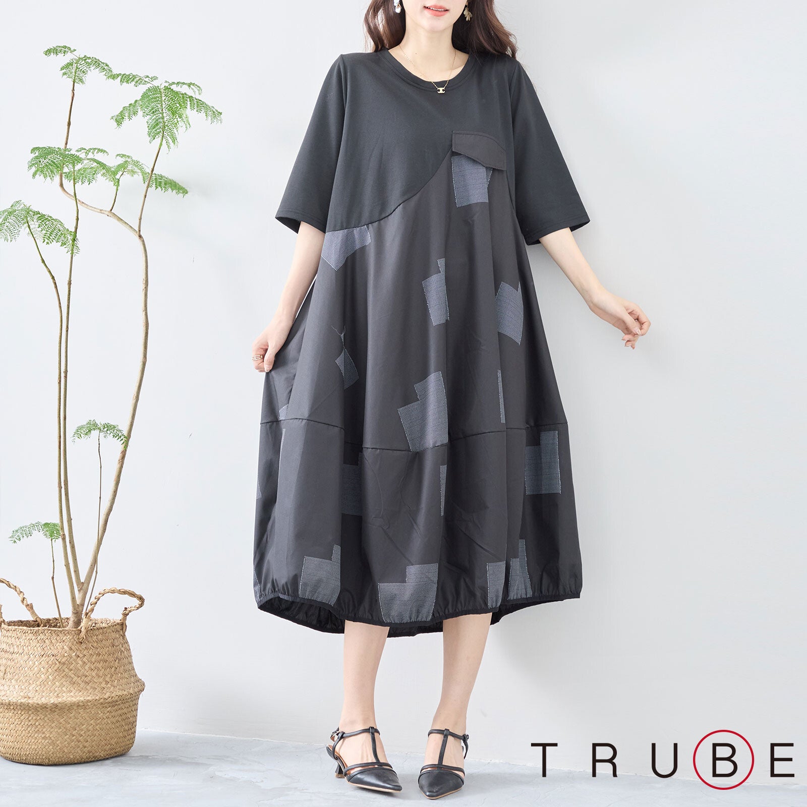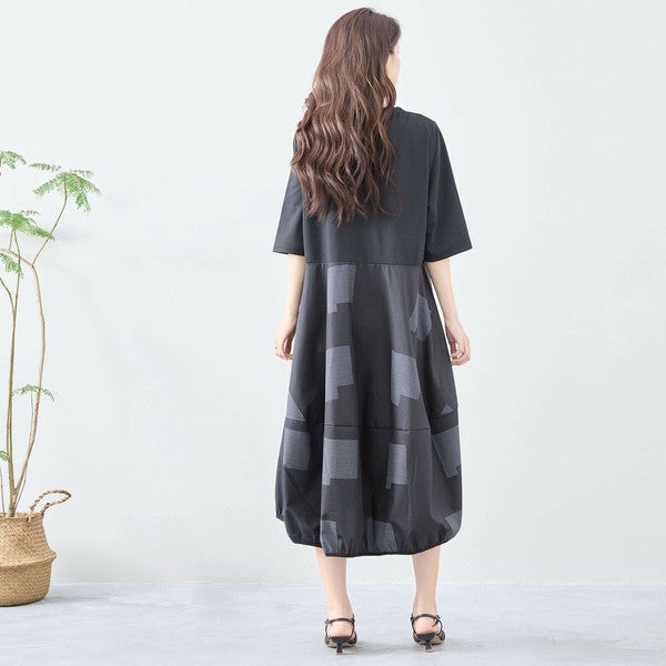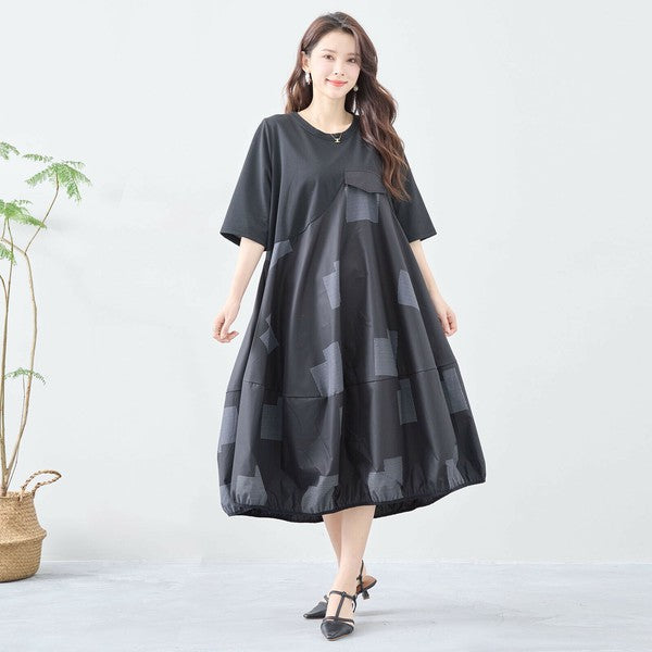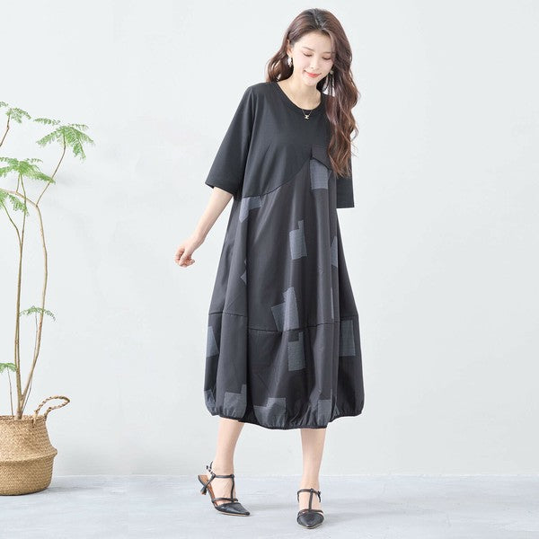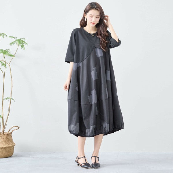 【L〜LL】異素材切り替え バルーンシルエットワンピース|モードな体型カバーコーデ(C08-241D)