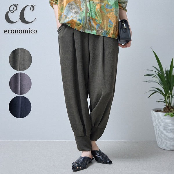 緩やかなカーブを描く立体的なシルエットが大人気の、Economicoの新作バナナパンツです。 落ち感のある「とろみ素材」を贅沢に使用し、フロントに生まれる美しいドレープが上品な印象を与えます。 ヒップや太ももをゆったりとカバーしつつ、裾に向かって細くなるテーパードラインで、穿くだけで美脚効果を発揮。 後ろウエストゴムでストレスフリーな穿き心地を実現しており、春夏のデイリースタイルからきれいめカジュアルまで幅広く活躍する優秀な一本です。