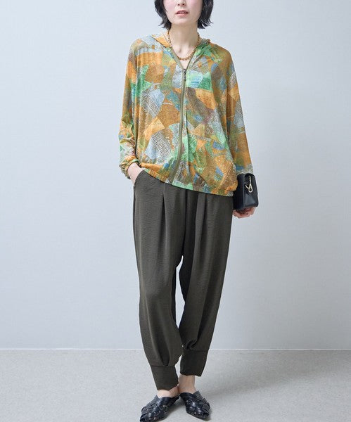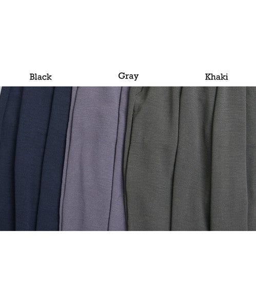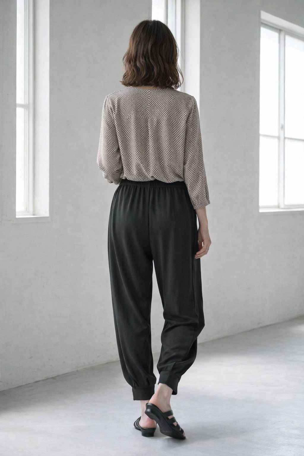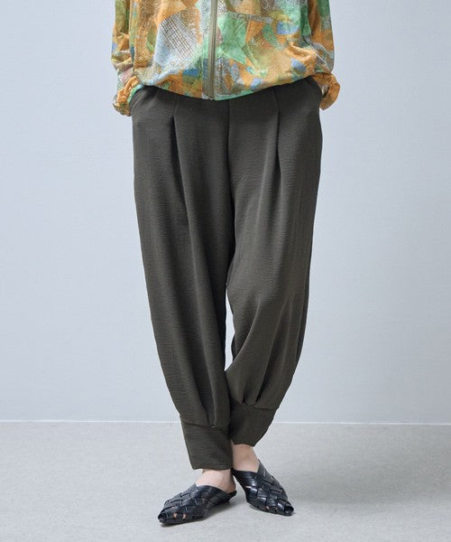 ■デザインのポイント ・とろみ素材: 落ち感がありシワになりにくく、上品なドレープを生み出します。 ・バナナシルエット: 下半身のラインを拾わず、すっきり見せる立体的なフォルム。 ・後ろウエストゴム: フロントはきれいに、穿き心地はラクチンなこだわりの仕様。
