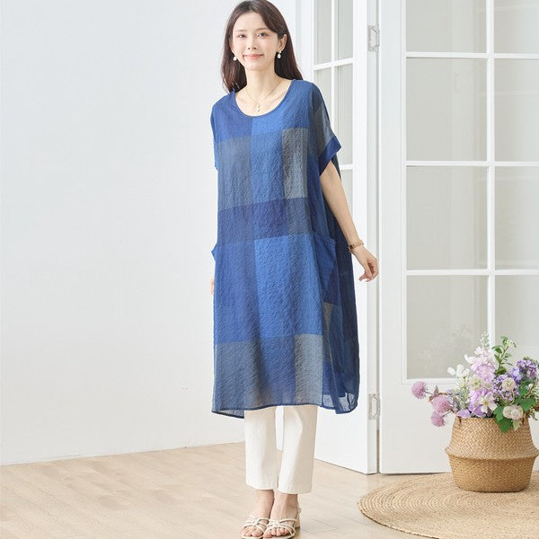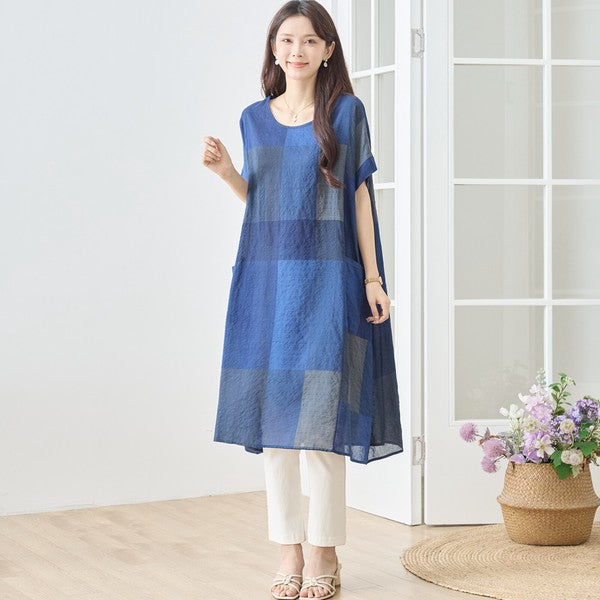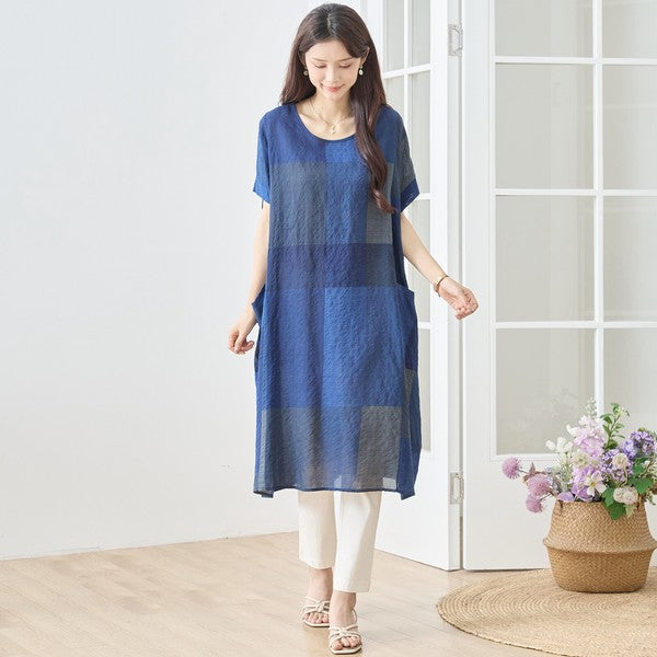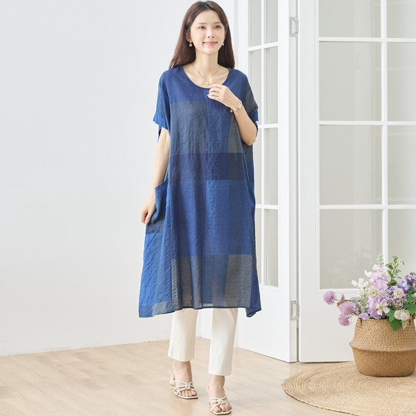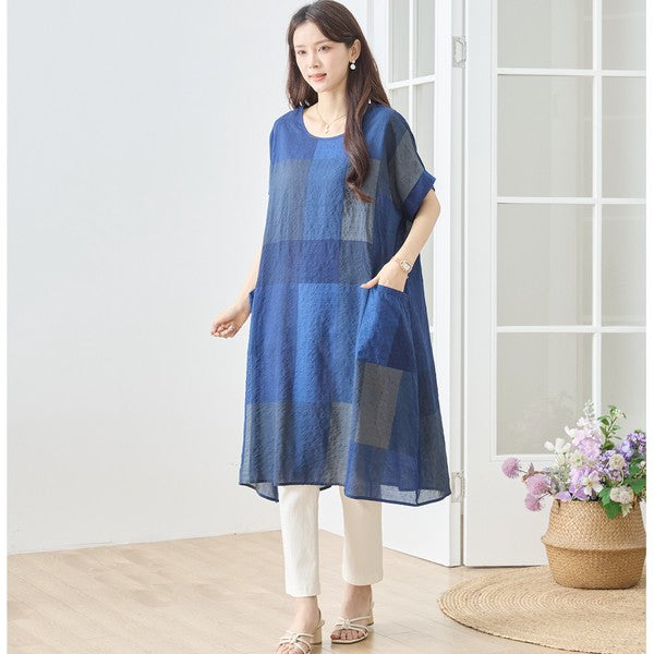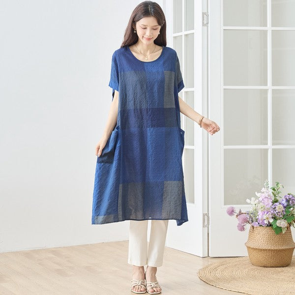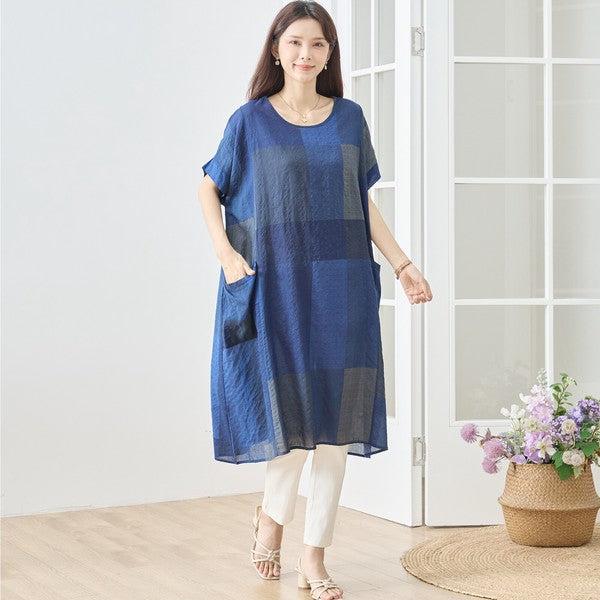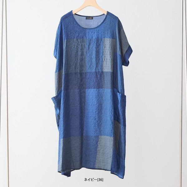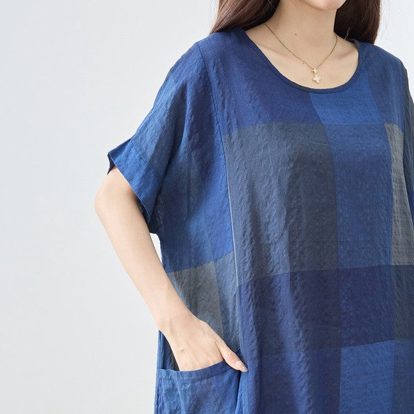 ・サイズ: L-LL ・実寸サイズ(cm): 着丈:105 / 肩幅:67 / 身幅:66 / 裾幅:90 (※平置き実寸です。多少の誤差はご容赦ください) ・カラー: 画像をご参照ください(ネイビー・ブルー系ブロックチェック) ・素材: 綿 100% ・生産国: 中国 ・スペック: ラウンドネック / フレンチスリーブ風 / ゆったりシルエット / 両サイドポケットあり