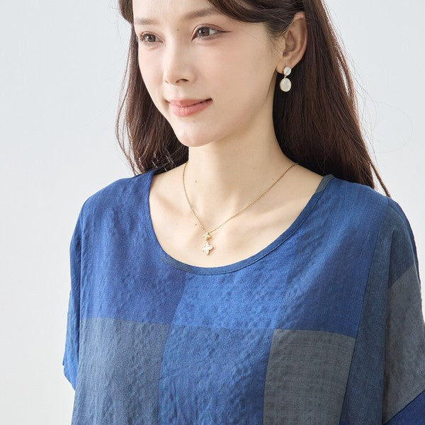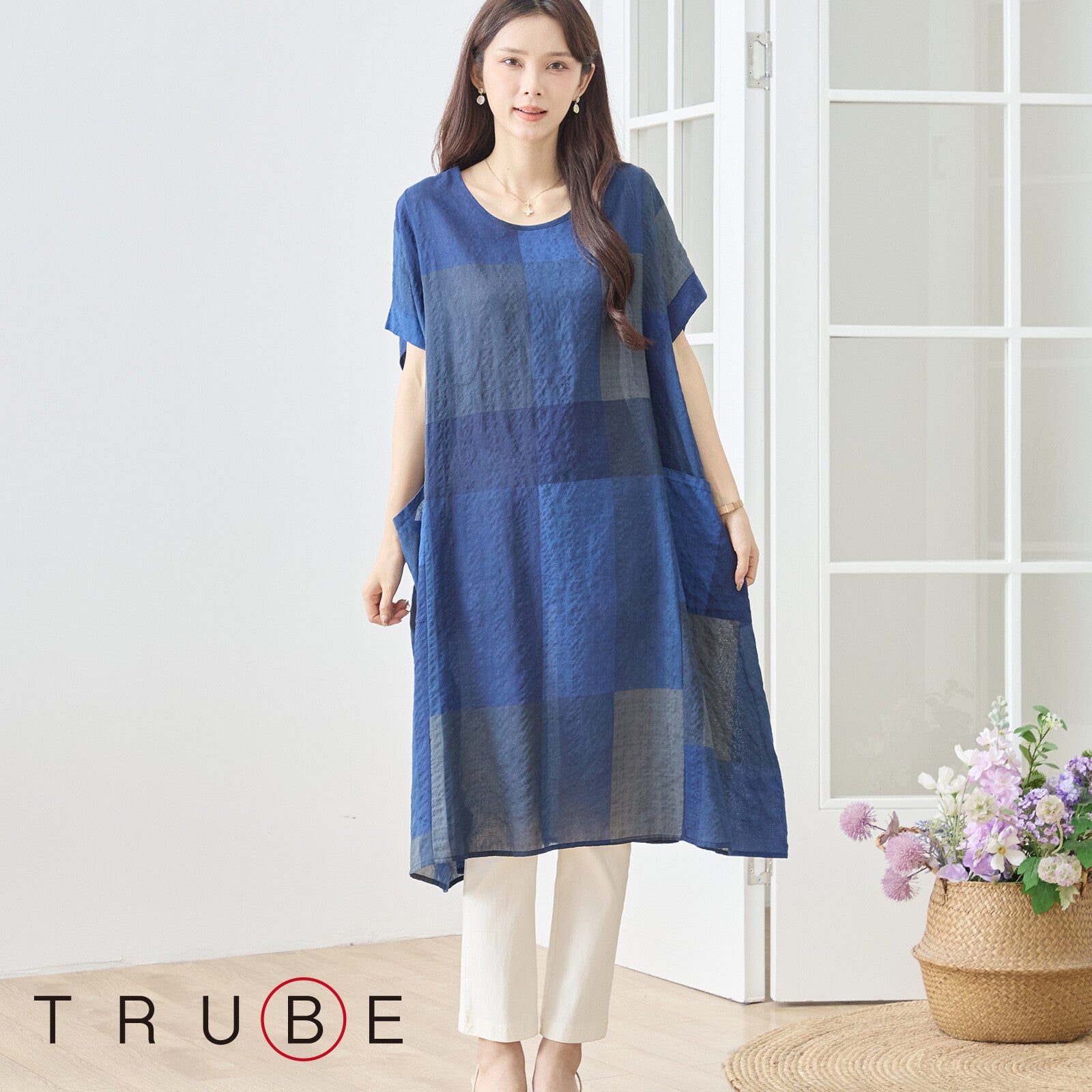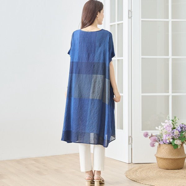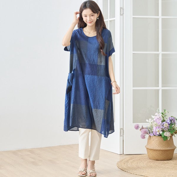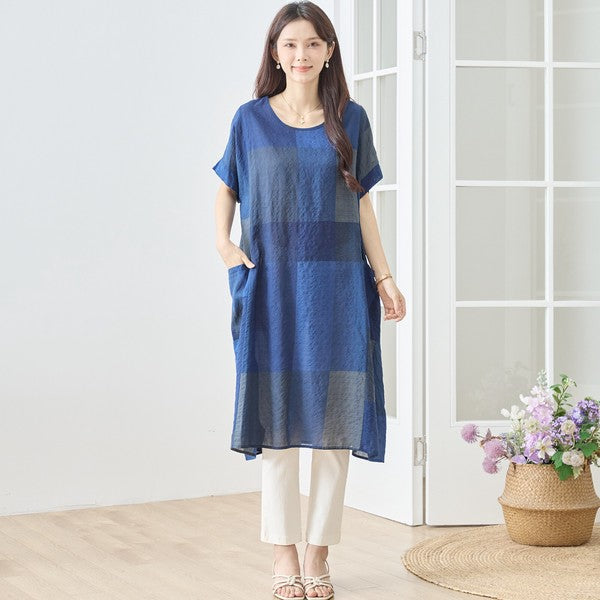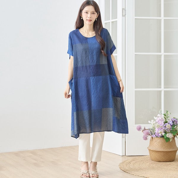 ・サイズ: L-LL ・実寸サイズ(cm): 着丈:105 / 肩幅:67 / 身幅:66 / 裾幅:90 (※平置き実寸です。多少の誤差はご容赦ください) ・カラー: 画像をご参照ください(ネイビー・ブルー系ブロックチェック) ・素材: 綿 100% ・生産国: 中国 ・スペック: ラウンドネック / フレンチスリーブ風 / ゆったりシルエット / 両サイドポケットあり