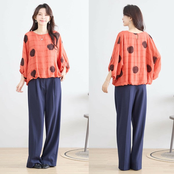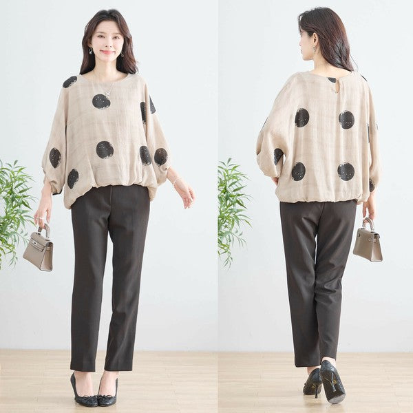 大胆なドット柄が印象的なブラウスは、着るだけでコーデが華やかに。ふんわりと広がるバルーンスリーブは二の腕を自然にカバーし、全体的にゆとりのあるシルエットが体型を気にせず着られる安心設計。ポリエステル素材で軽やかに仕上げており、春夏の装いにぴったりです。後ろボタンのアクセントも程よい可愛らしさをプラス。日常使いからお出かけまで幅広く活躍する一枚です。
