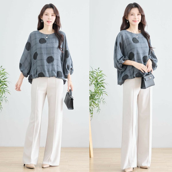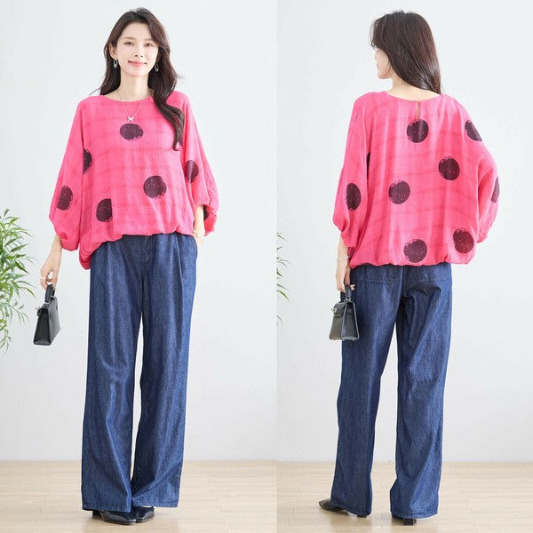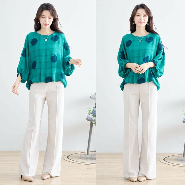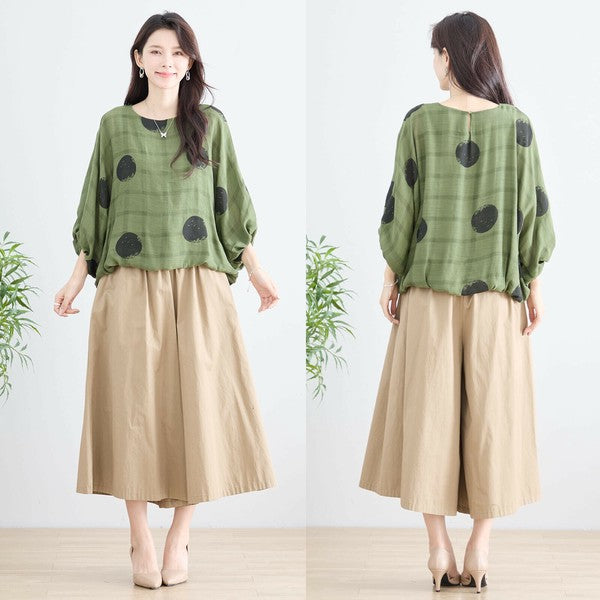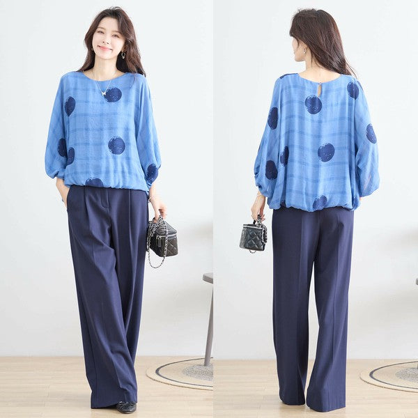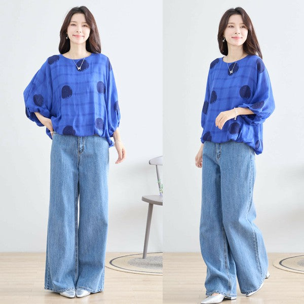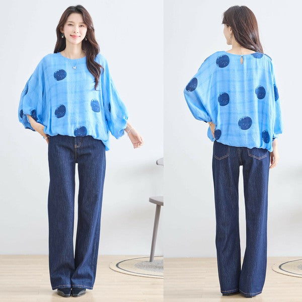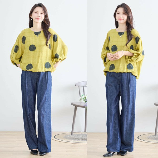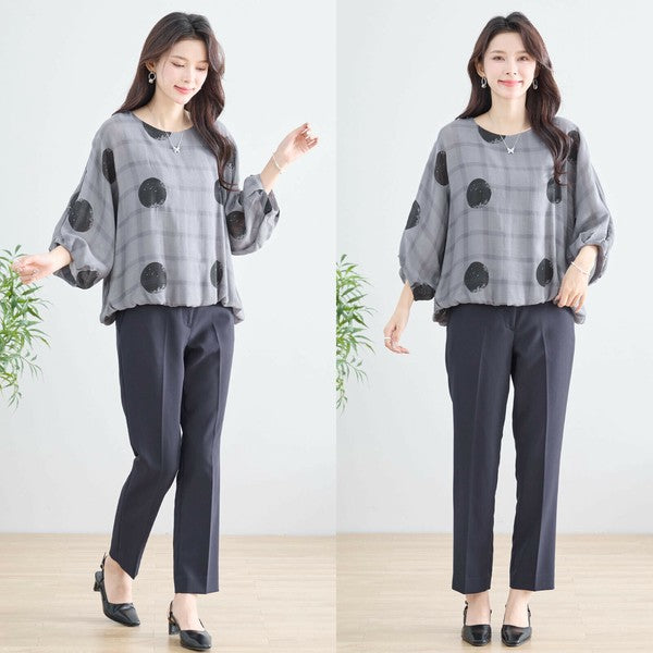 【M〜L】ポリエステル ドット柄バルーンスリーブブラウス|体型カバー 春夏 涼感 N13-286