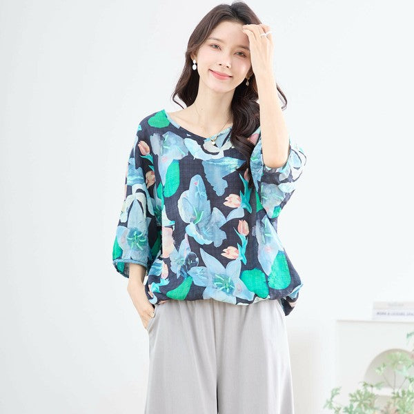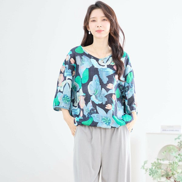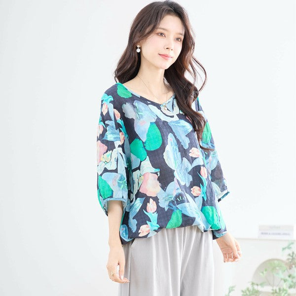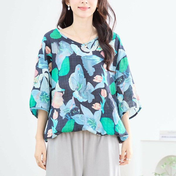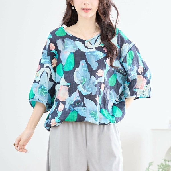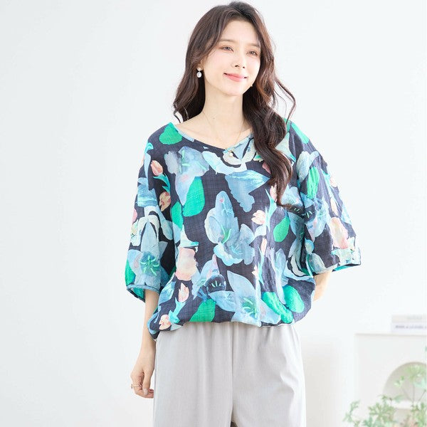 【M〜L】綿100% 花柄Vネックゆったりブラウス|アートフローラル・ネイビー(N13-258)