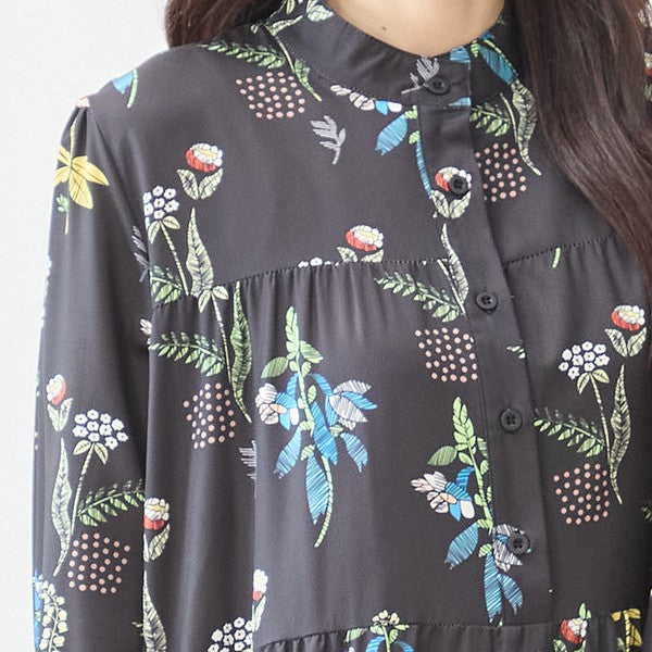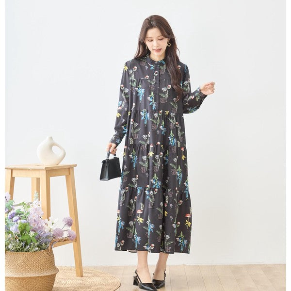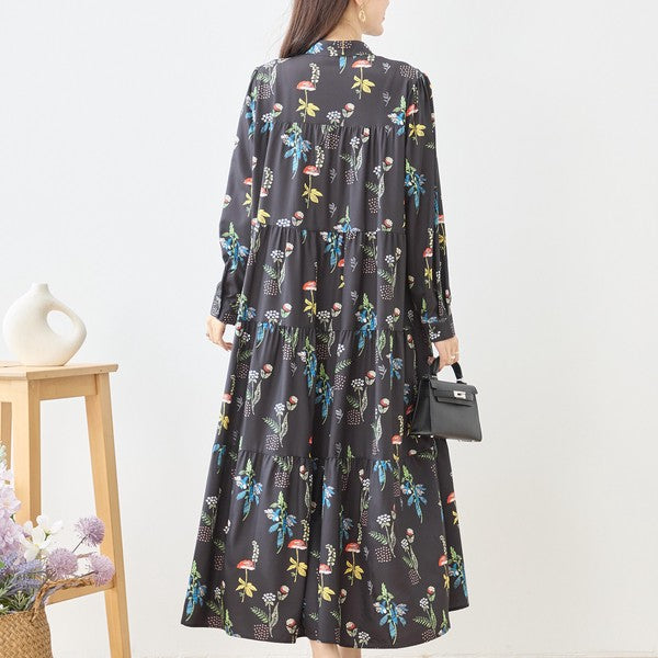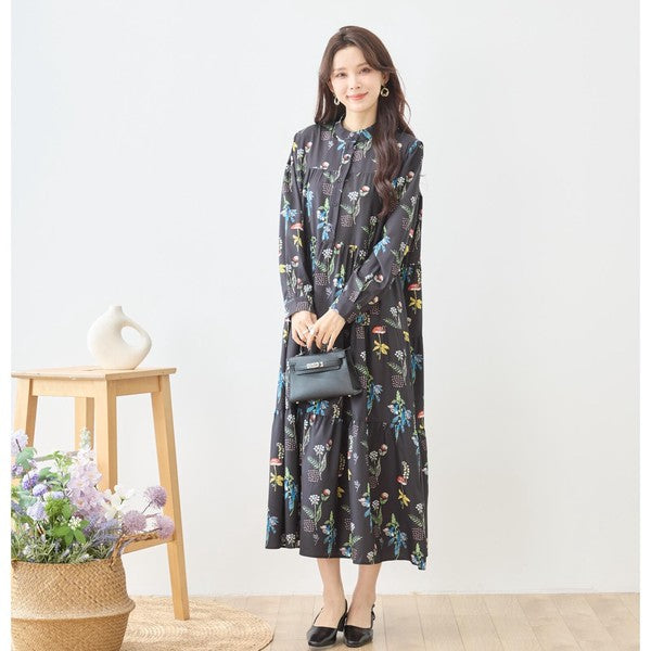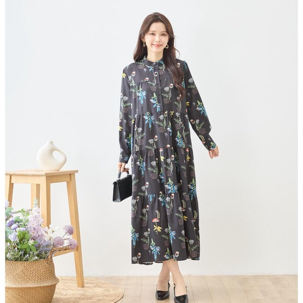 ボタニカルプリント ティアードワンピース 長袖 フロントボタン 花柄 ロング丈 きれいめ 大人カジュアル