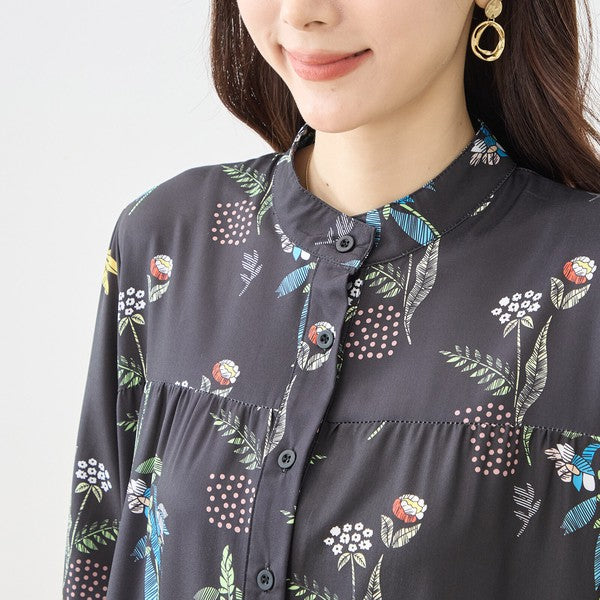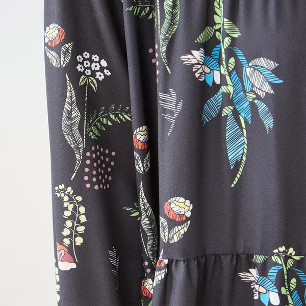 落ち着きのあるブラックをベースに、色鮮やかな花や葉が描かれたボタニカル柄を全面にプリント。 甘くなりがちなティアードデザインも、シックなカラーリングと上品な柄行きによって、洗練された大人カジュアルへと昇華されています。