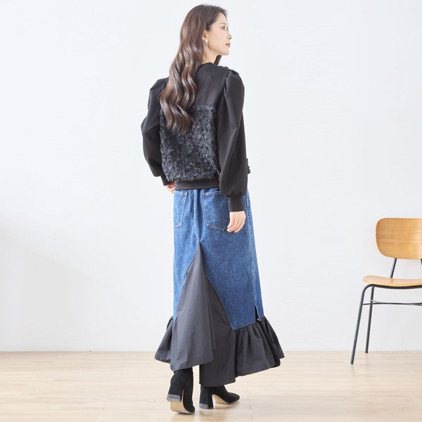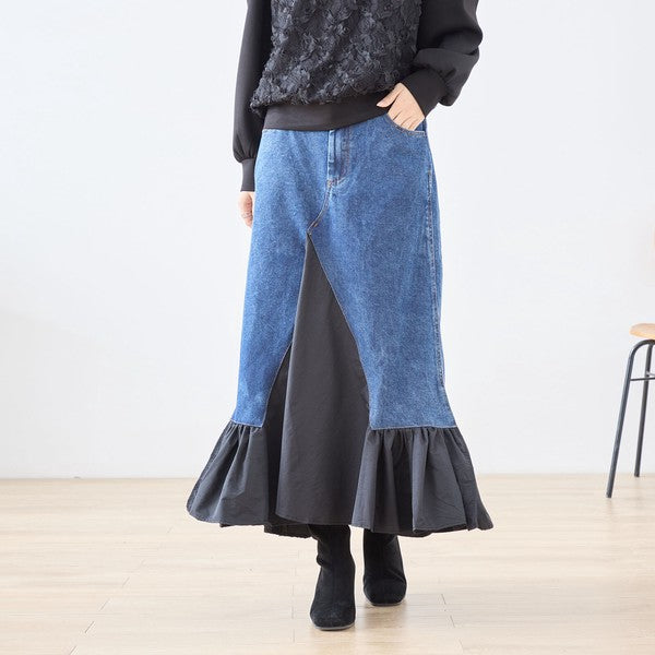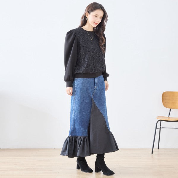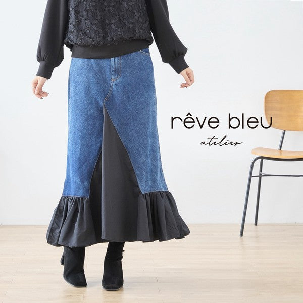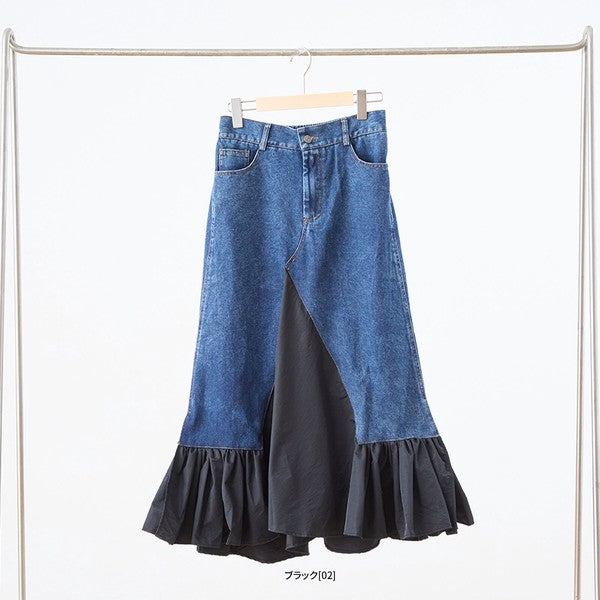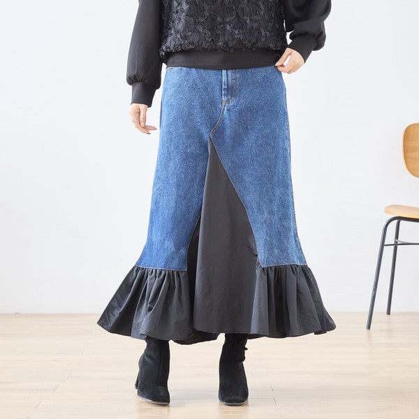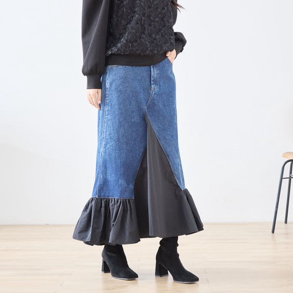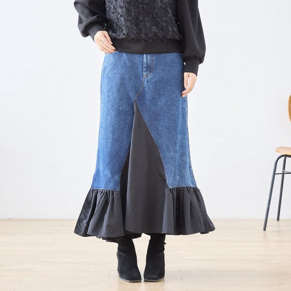 デニム×布帛地の異素材切り替えがポイントのロングスカート