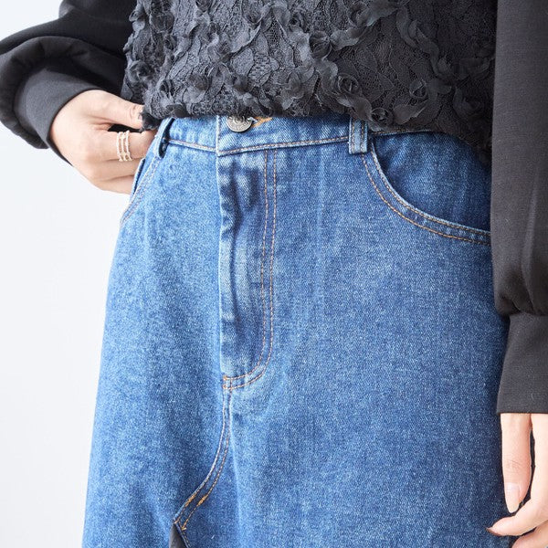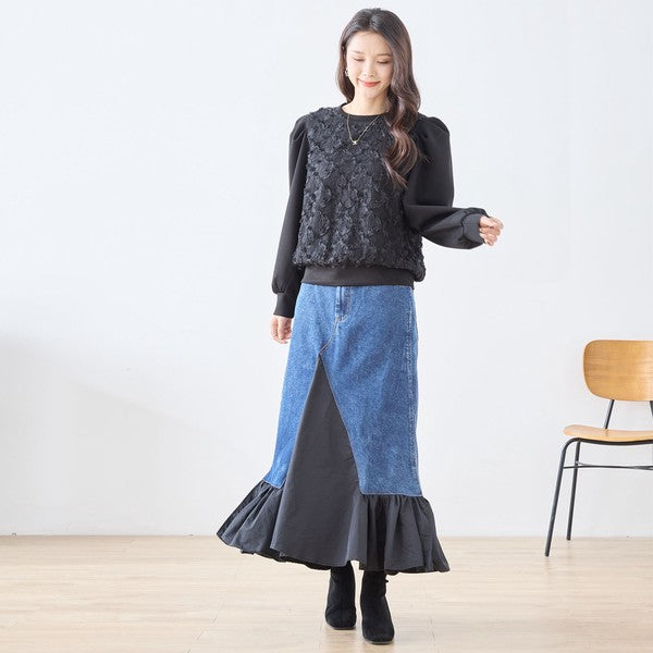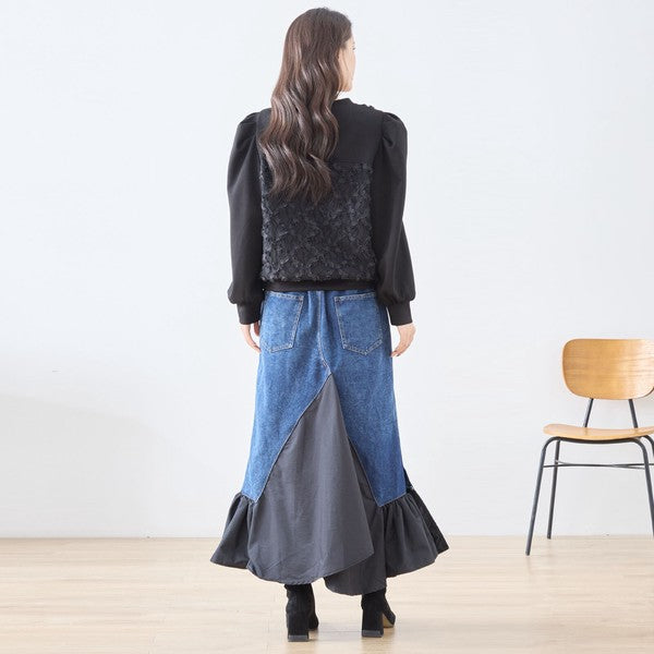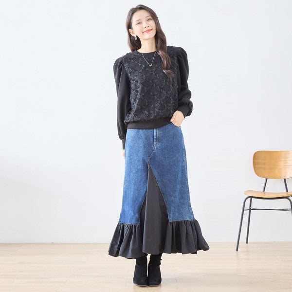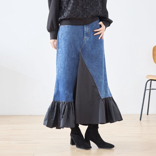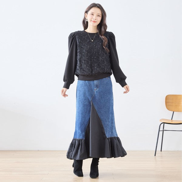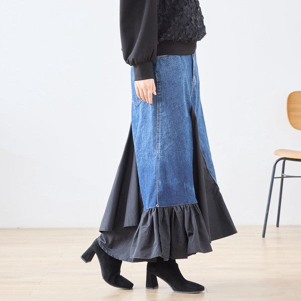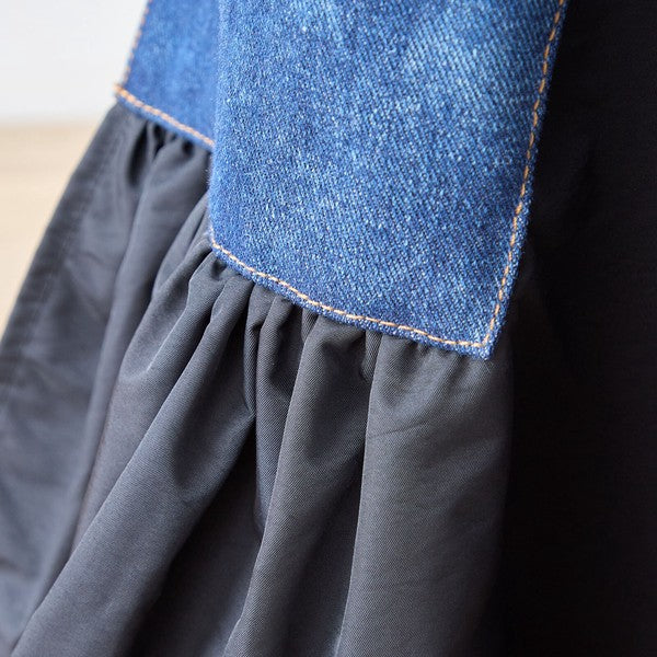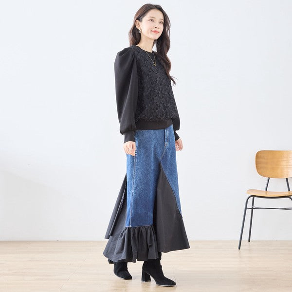 デニム×布帛地の異素材切り替えがポイントのロングスカート