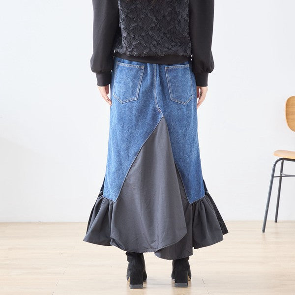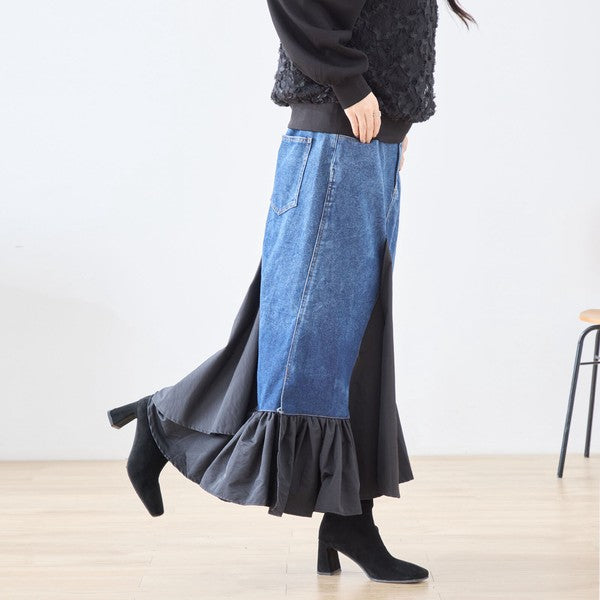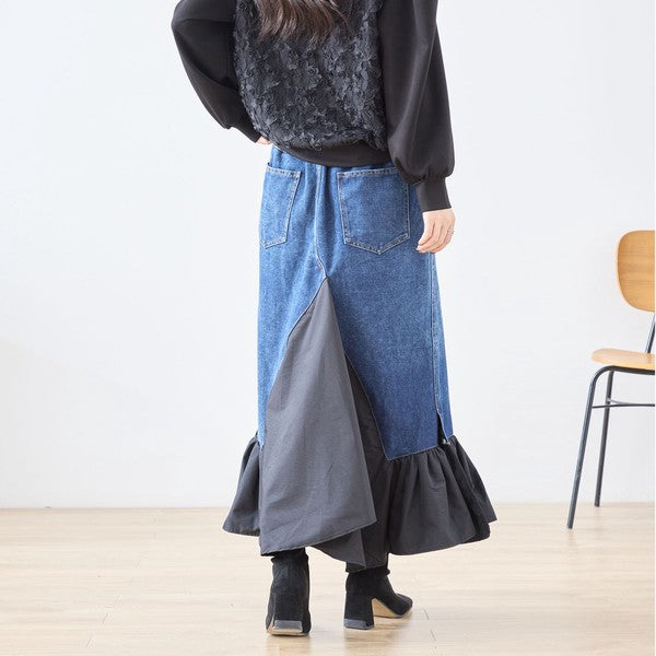 【M〜L】異素材切り替えデニムロングスカート|裾フレア・マーメイドライン・11903851