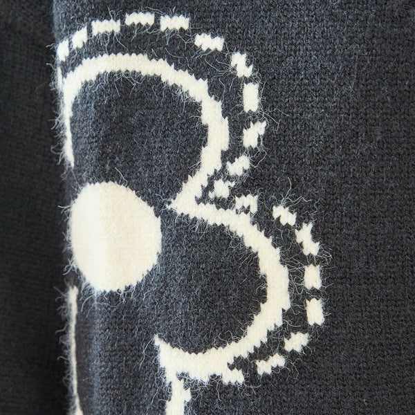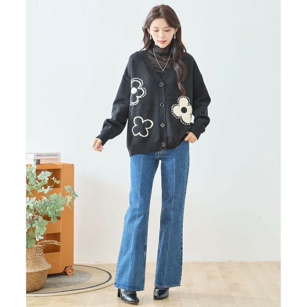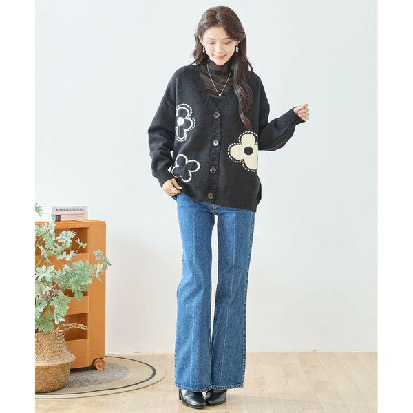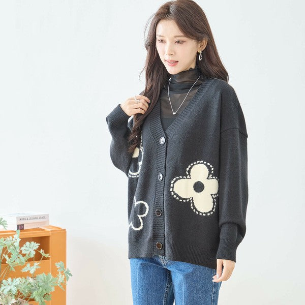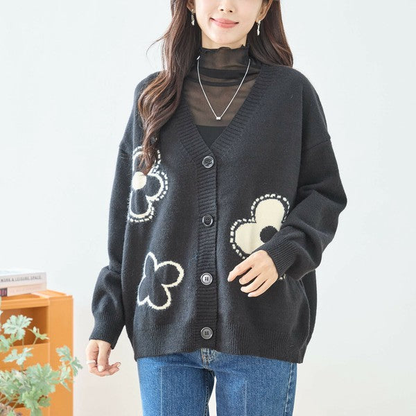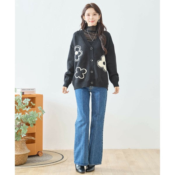 モノトーンでまとめたフラワーデザインが印象的なニットカーディガン