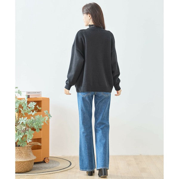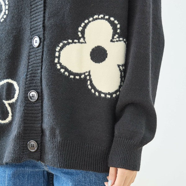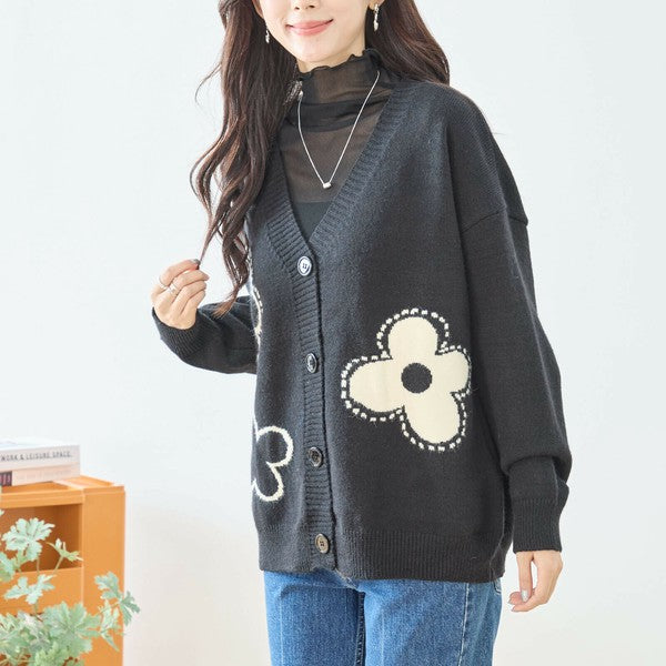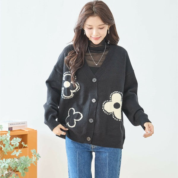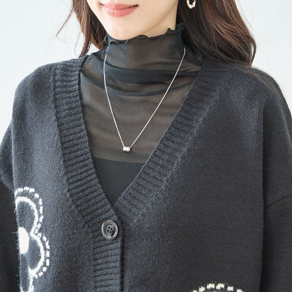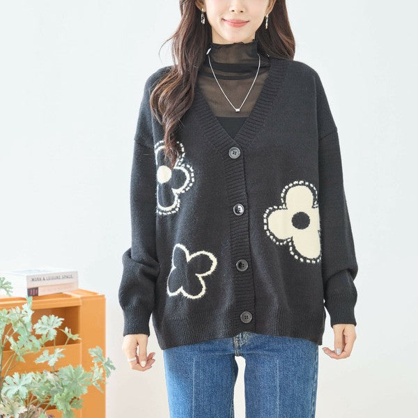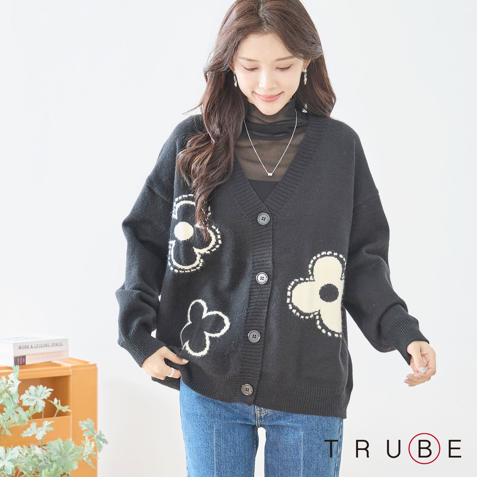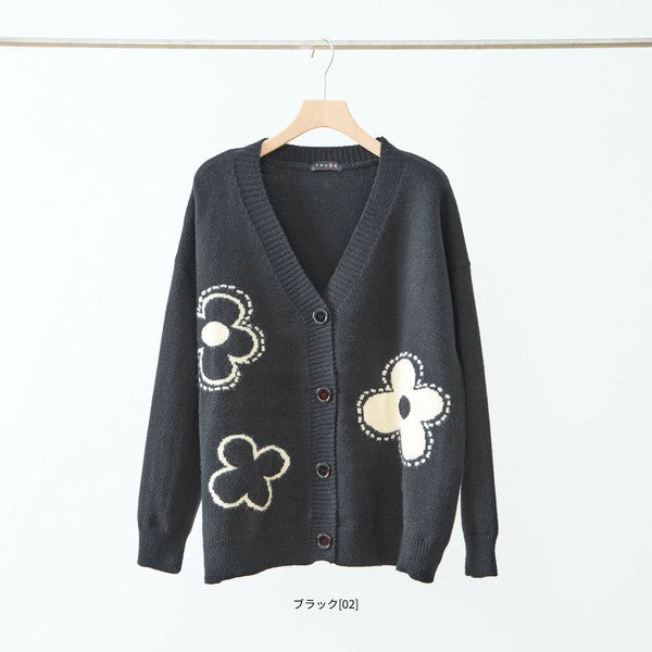【L〜LL】モノクロフラワー柄ニットカーディガン|ゆったりシルエット・大人カジュアル・TRUBE N25-273