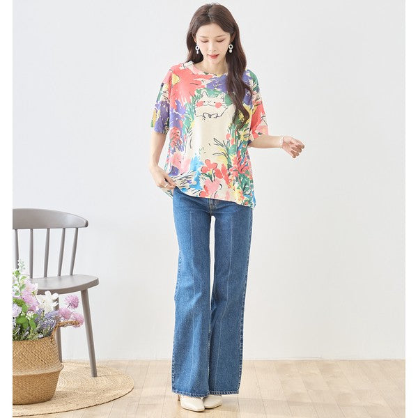 ■デザインのポイント ・アートプリント: 絵画のような花柄と猫のモチーフが、圧倒的な存在感を放ちます。 ・サマーニット素材: レーヨン混のサラリとした生地感で、上品な落ち感を演出。 ・ゆったりシルエット: ドロップショルダーで華奢見え&リラクシーな着心地。