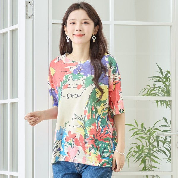 キャット アートプリント サマーニット トップス 半袖 花柄 猫柄 レーヨン混 ゆったり 春夏