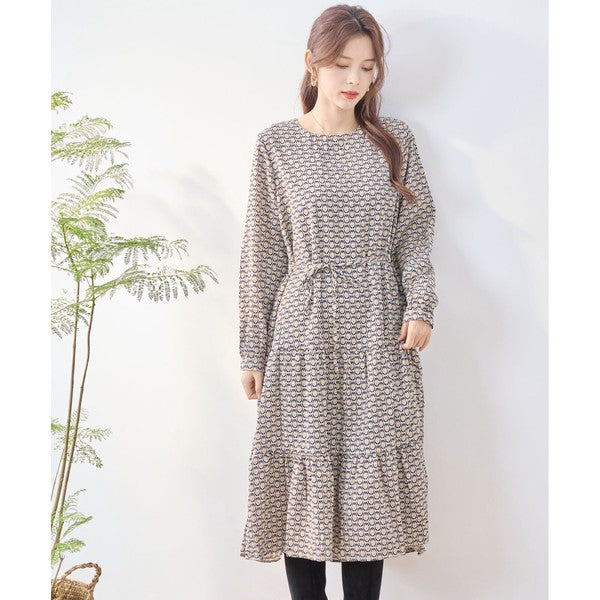 ・スペック: チェーン柄(幾何学柄)総柄プリント / ティアードデザイン / ウエストドローストリング(絞り紐)あり / 長袖 / ロング丈 / クルーネック / 伸縮性なし / 透け感なし / 裏地あり