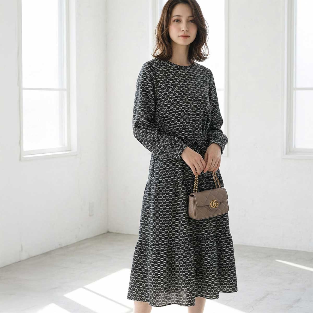 ブラックベースの生地にホワイトのチェーン柄(幾何学柄)が総柄でプリントされた、レトロでクラシカルなデザイン。 甘くなりがちなティアードワンピースも、落ち着いたモノトーンの配色と上品な柄行きにより、洗練された大人の着映えスタイルへと昇華させています。