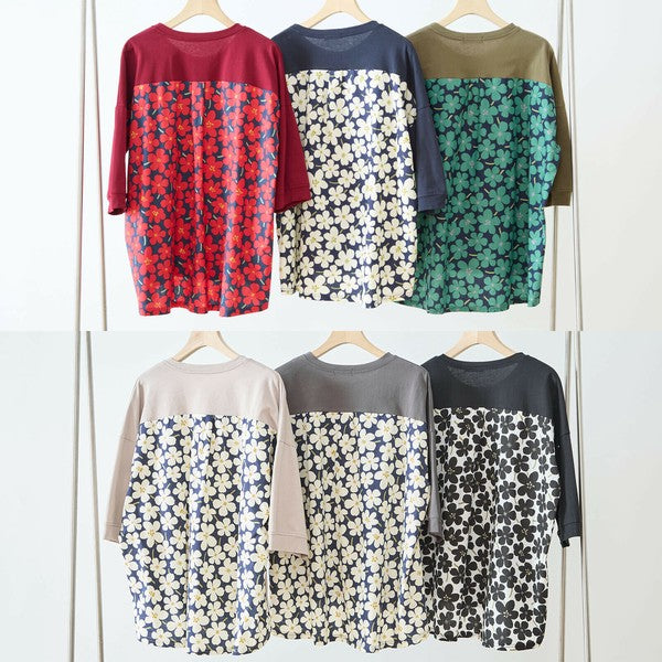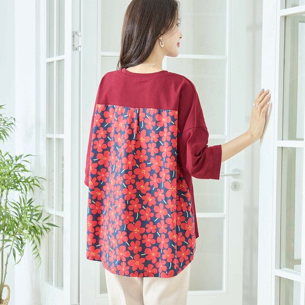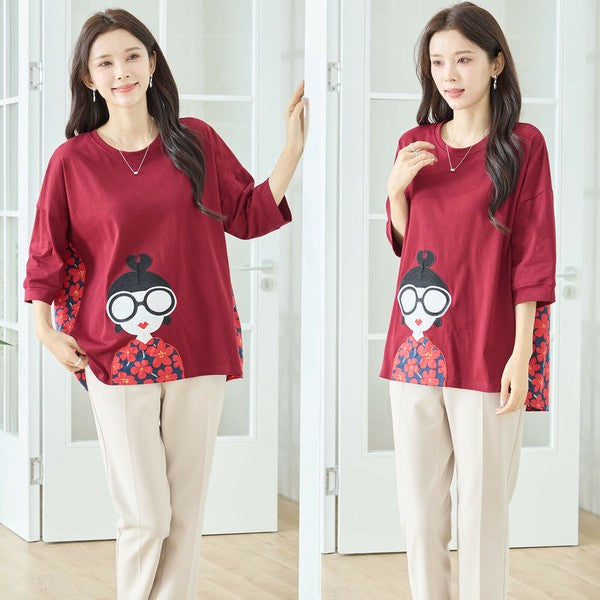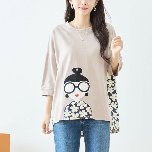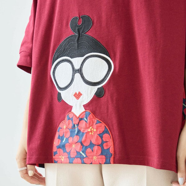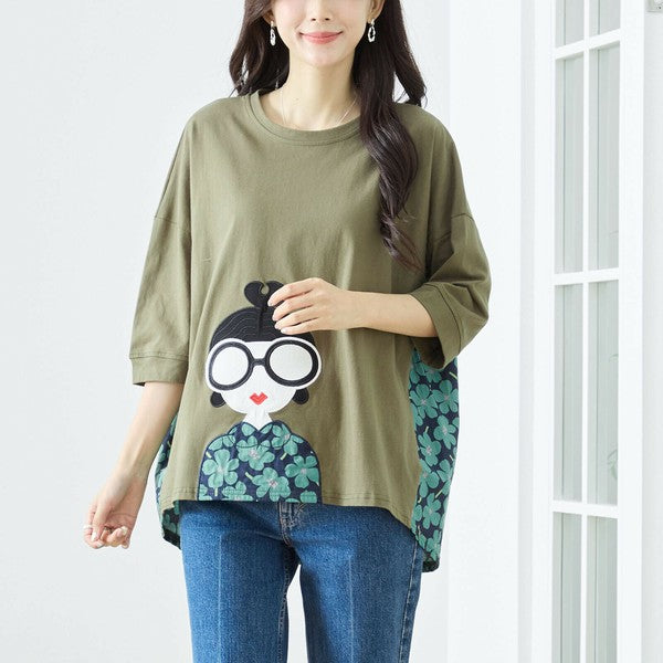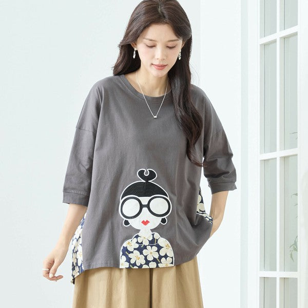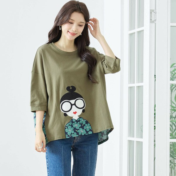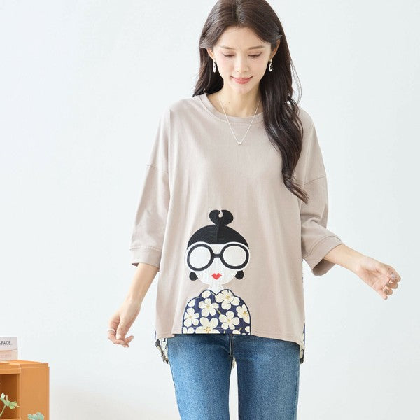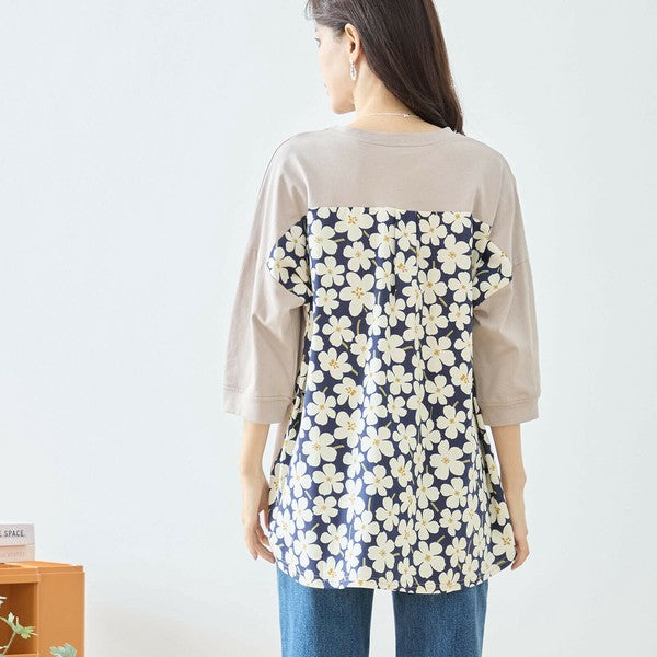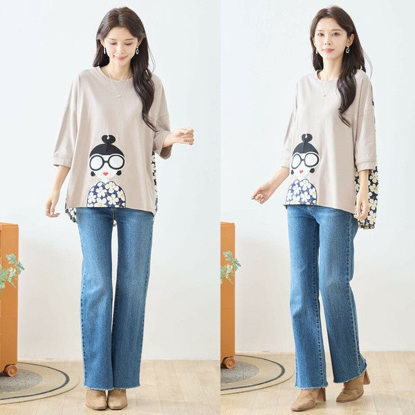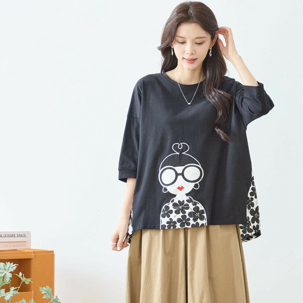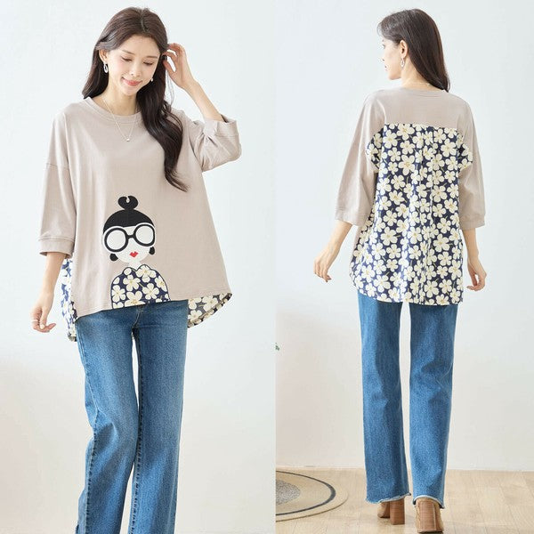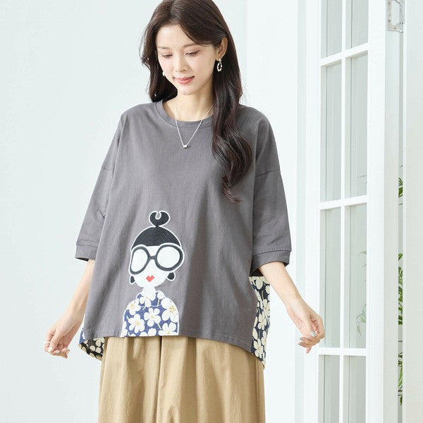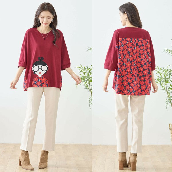 【M〜L】レトロガールプリント バックフラワーカットソー|異素材デザイン・ゆったりシルエット・TRUBE N13-320