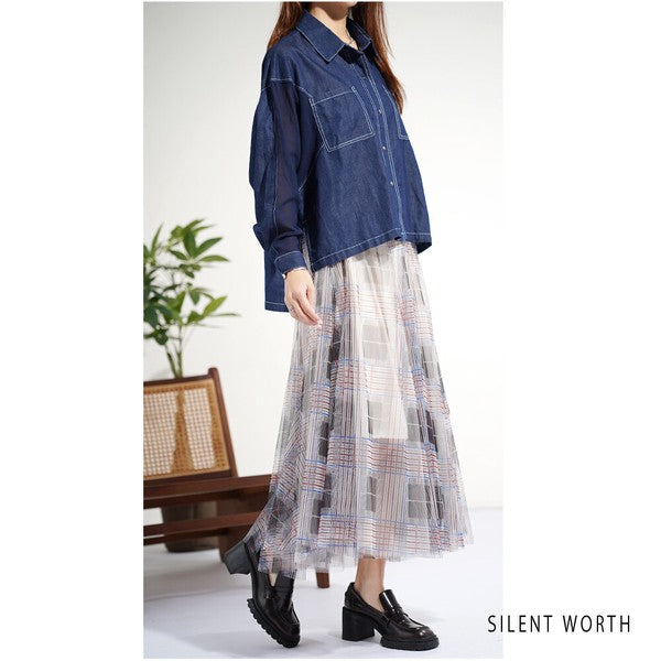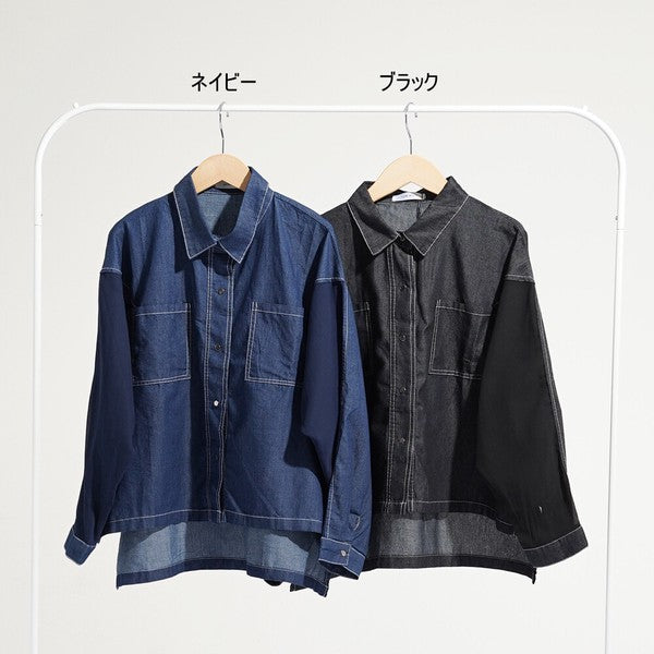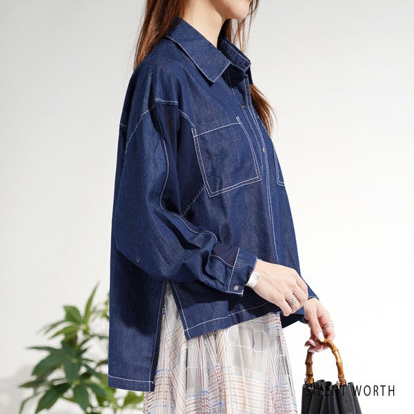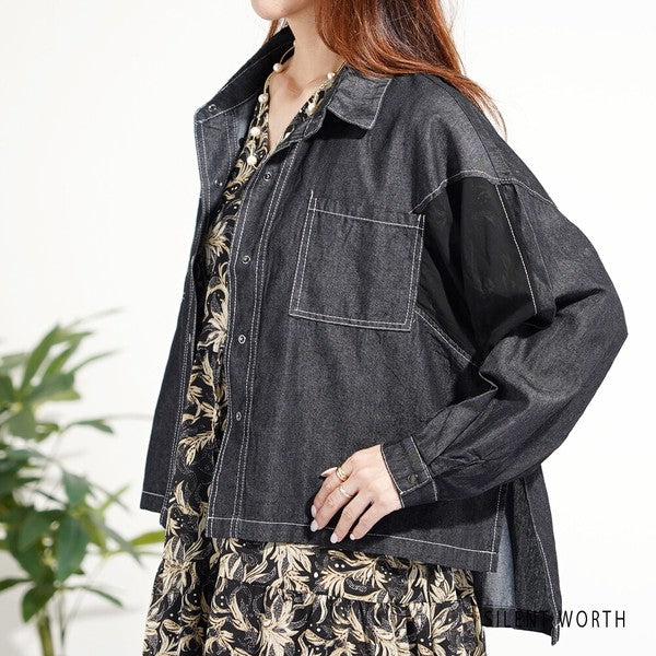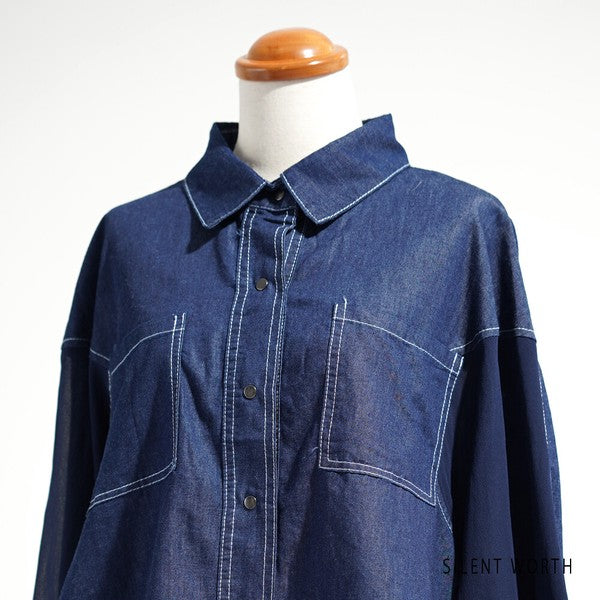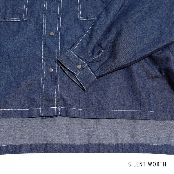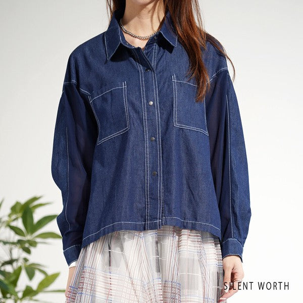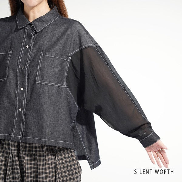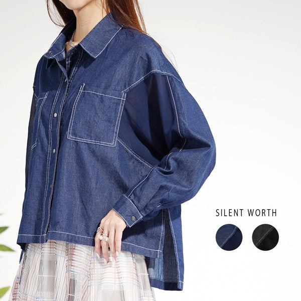 【M】デニム×シアー切替ビッグシャツ 異素材ドッキング ステッチ ライトアウター モード SILENT WORTH
