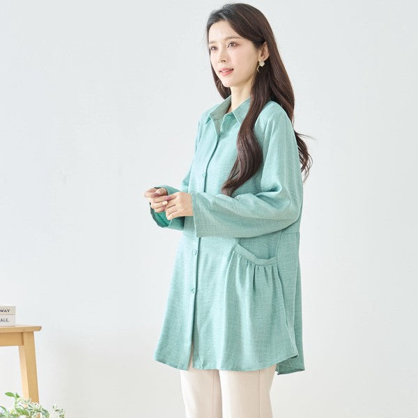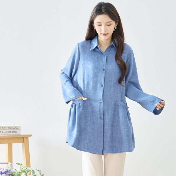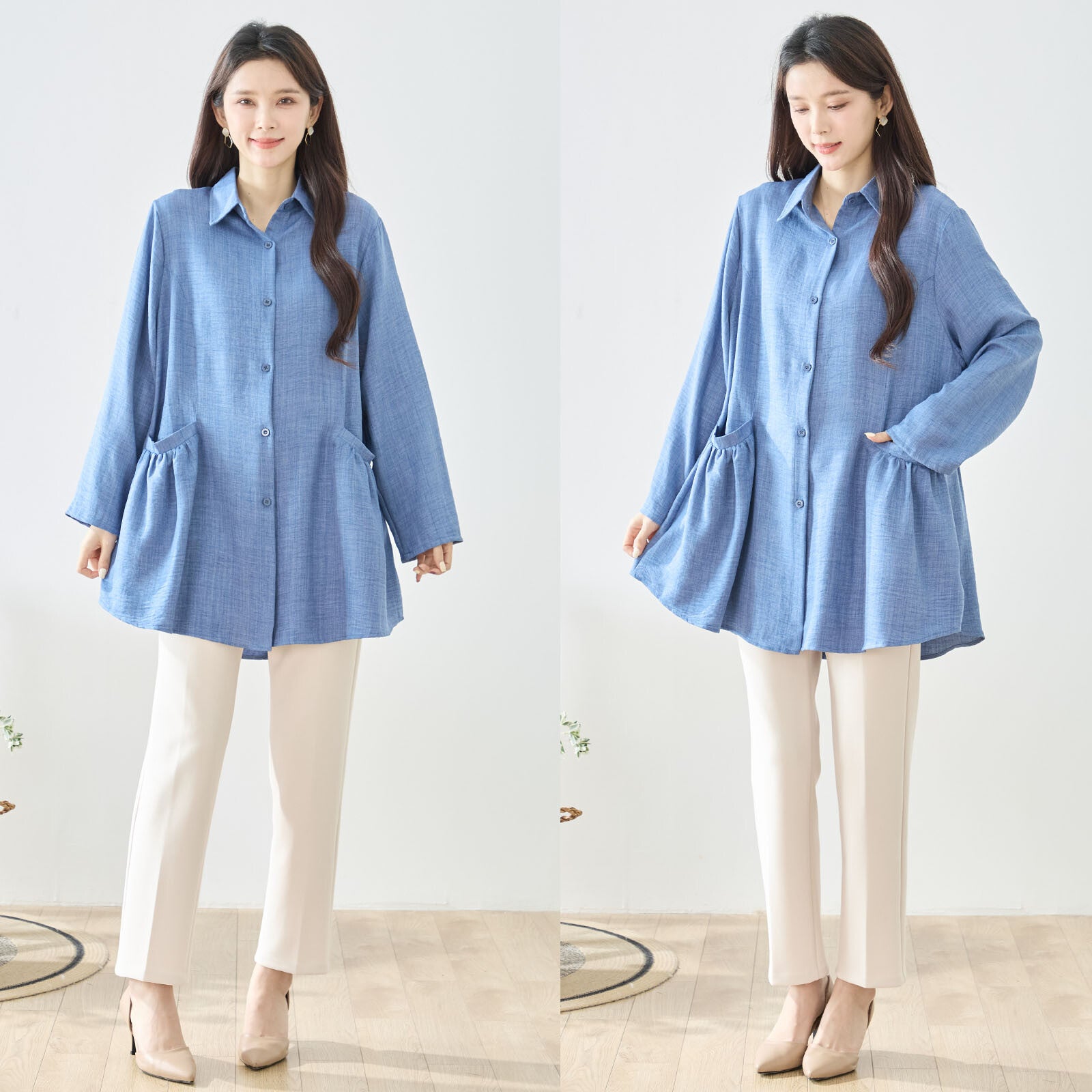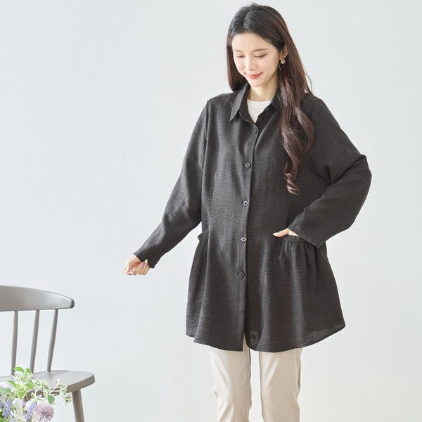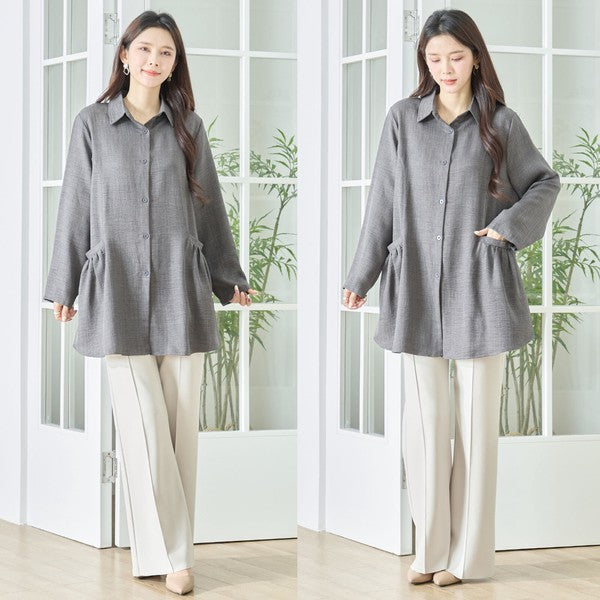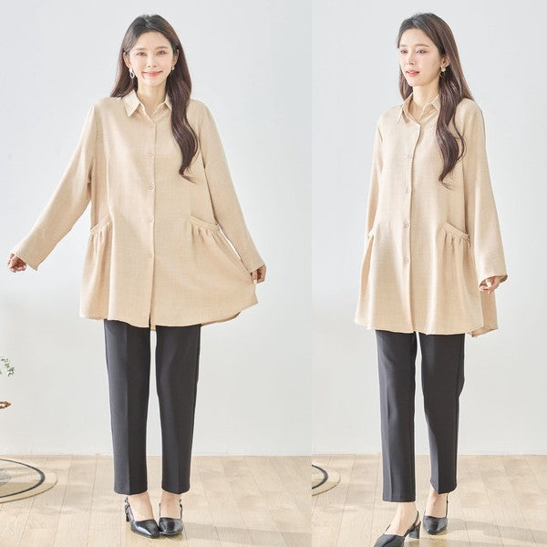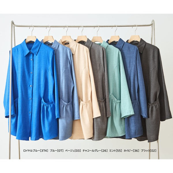 ・スペック: サイドギャザーポケット / フレアシルエット / 襟付き(シャツカラー) / 前開きボタン / ロング丈(チュニック)