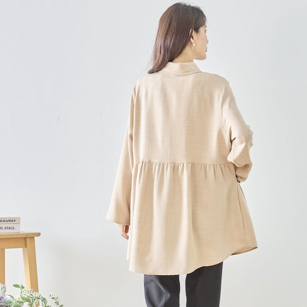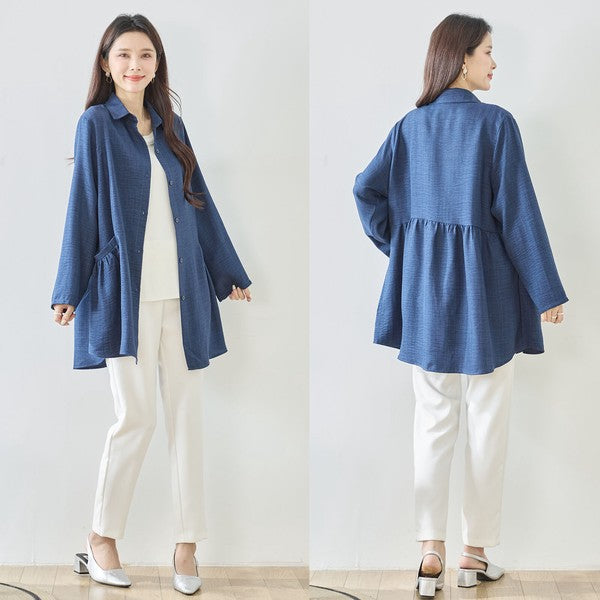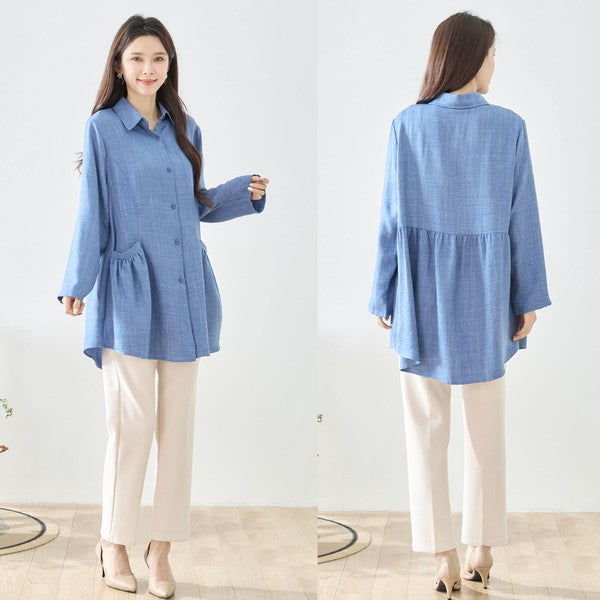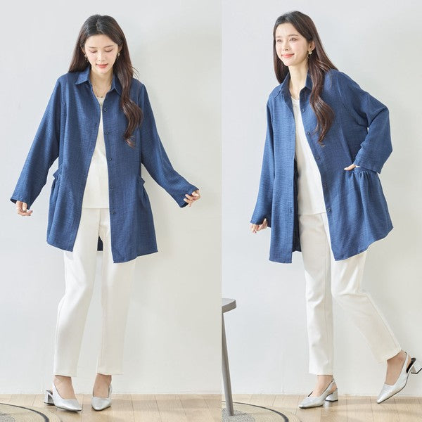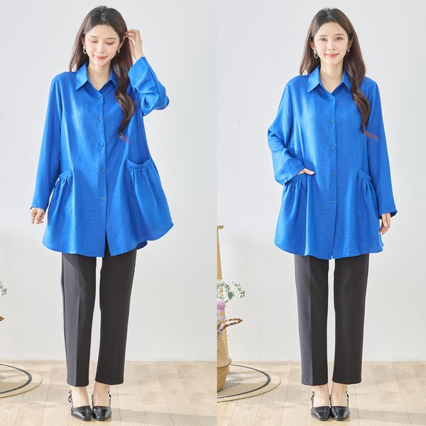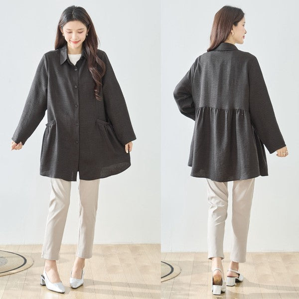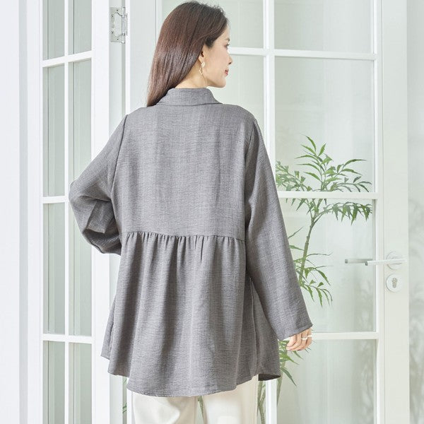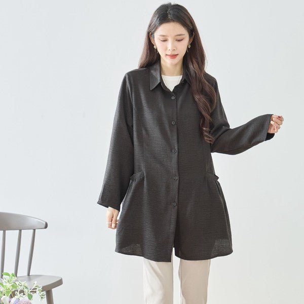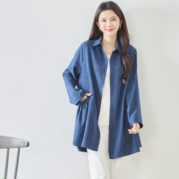 ・スペック: サイドギャザーポケット / フレアシルエット / 襟付き(シャツカラー) / 前開きボタン / ロング丈(チュニック)