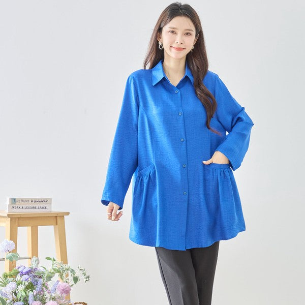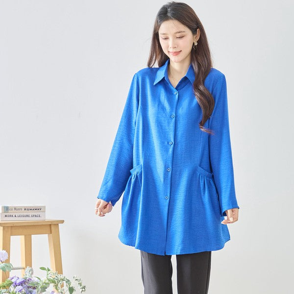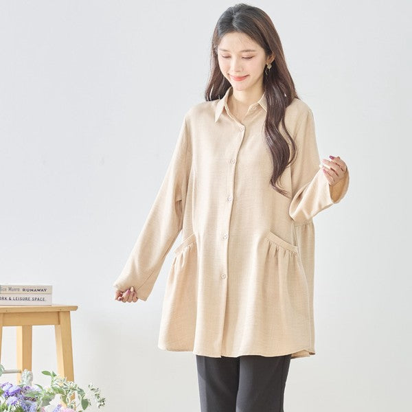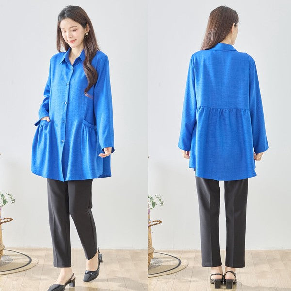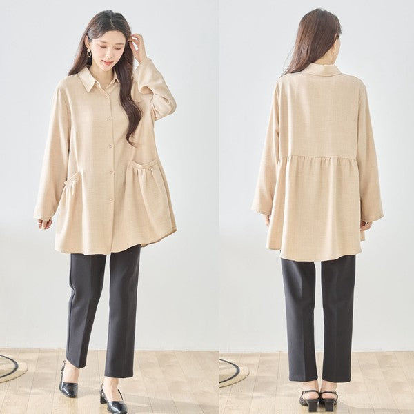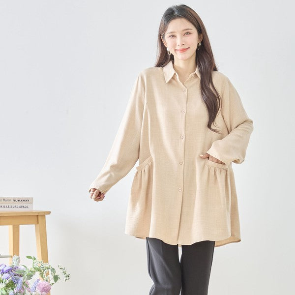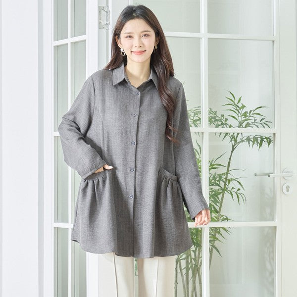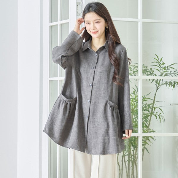 フレアポケット シャツチュニック 長袖 襟付き 前開き 体型カバー ゆったり 羽織り