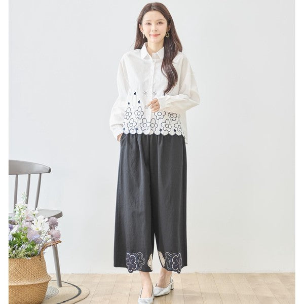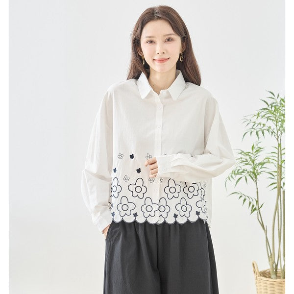 裾部分にぐるりとあしらわれた大きめのフラワー(花柄)刺繍が、パッと目を惹く華やかなアクセントに。 裾のラインを刺繍に合わせて波打つようにカットした「スカラップヘム」仕様になっており、アウトスタイルで着た時のシルエットが最高に可愛い、主役級のデザインシャツです。
