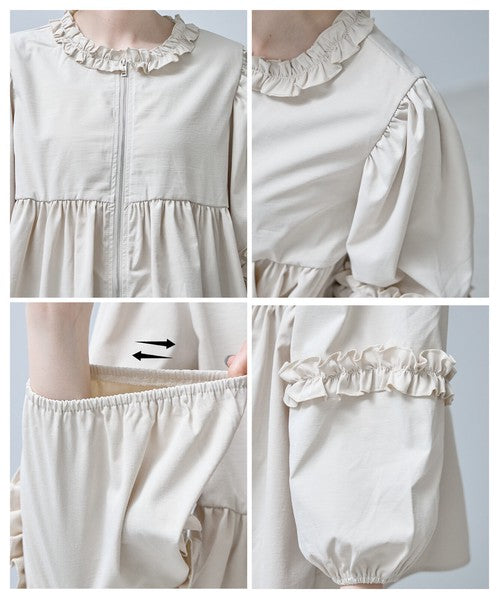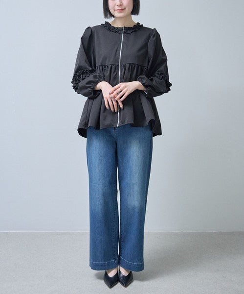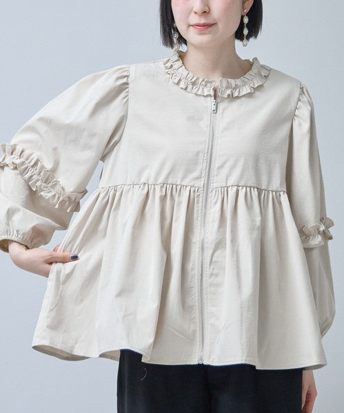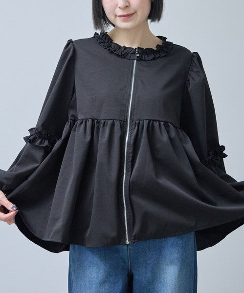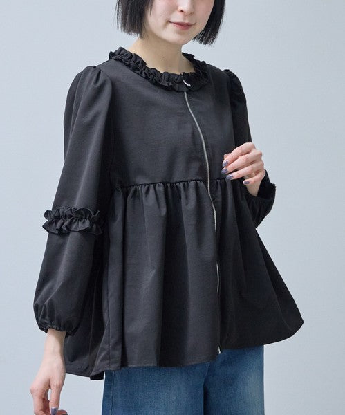 フリルカラー ジップアップ ジャケット ペプラム ギャザー ボリューム袖 ライトアウター