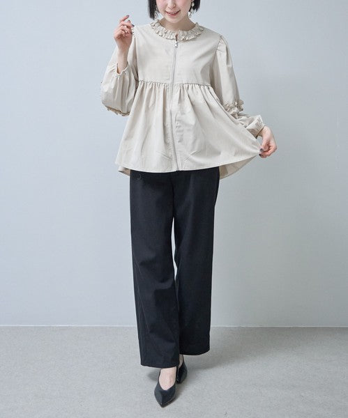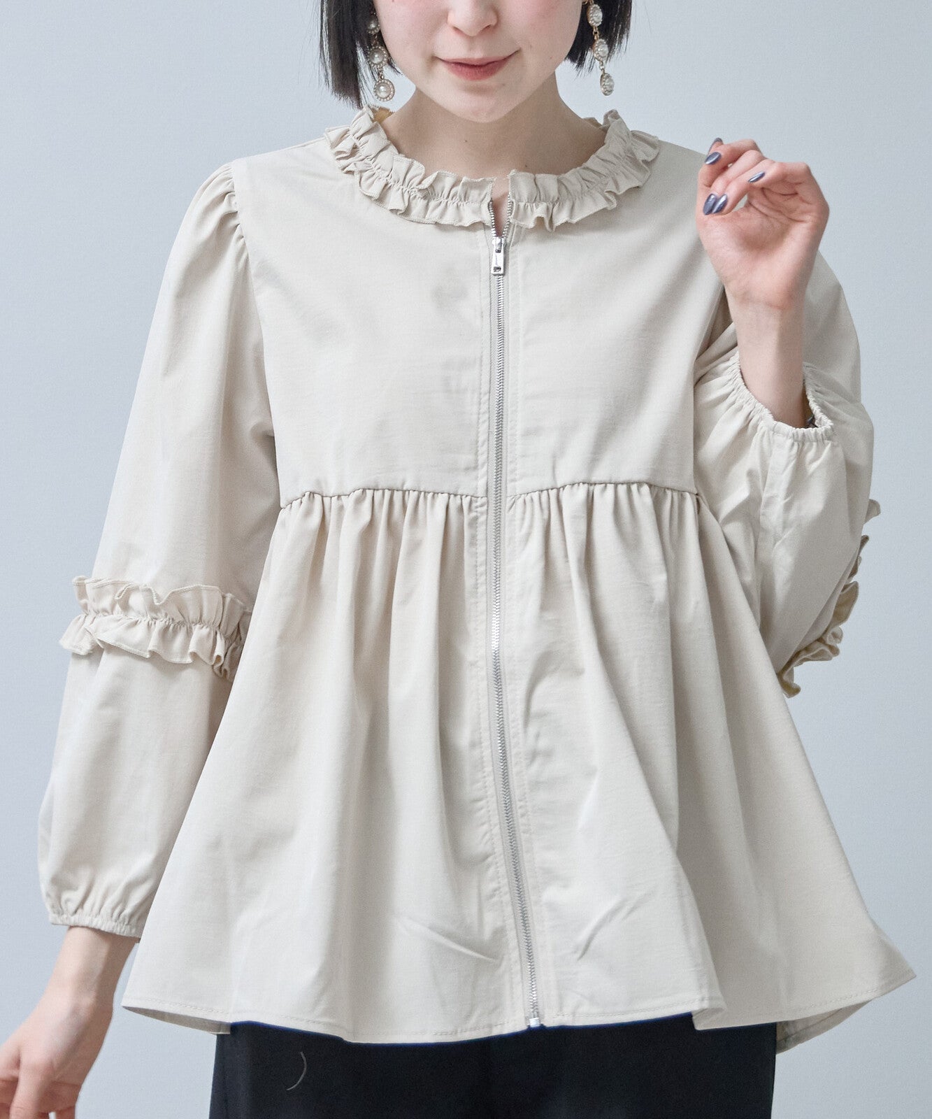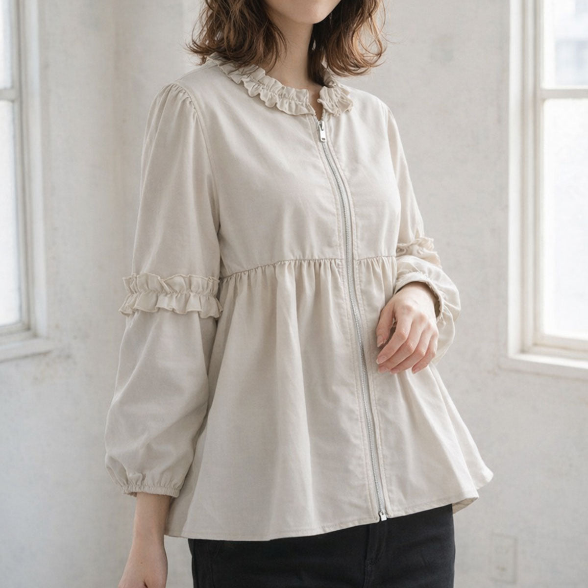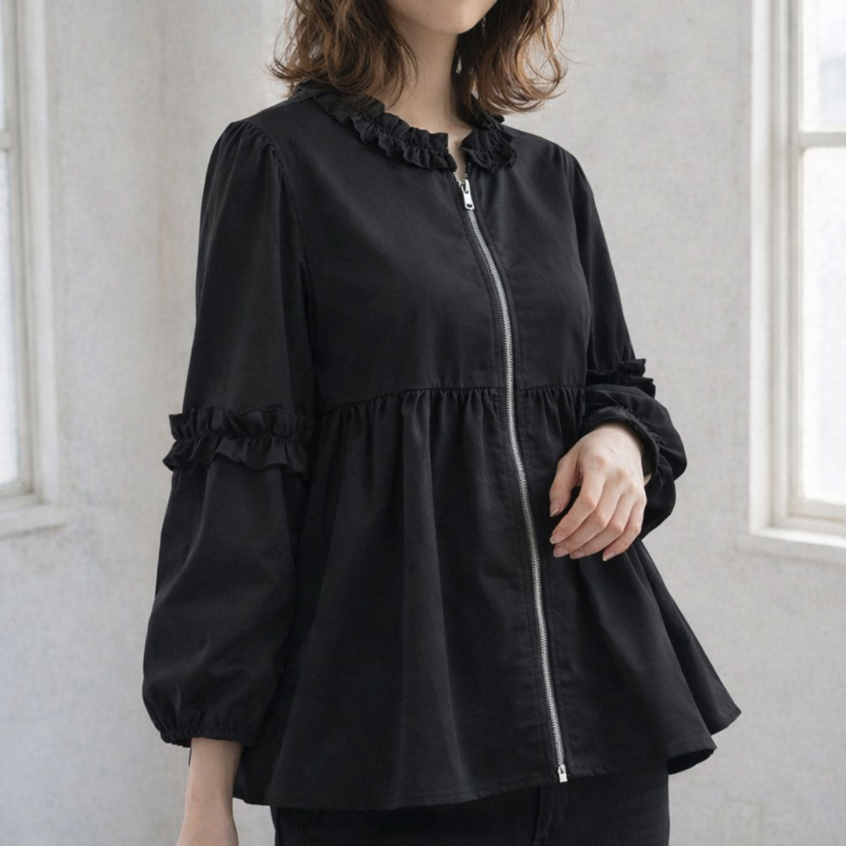 スペック: フリル襟 / ジップアップ / ペプラムシルエット / 伸縮性なし / 透け感なし / ポケットなし