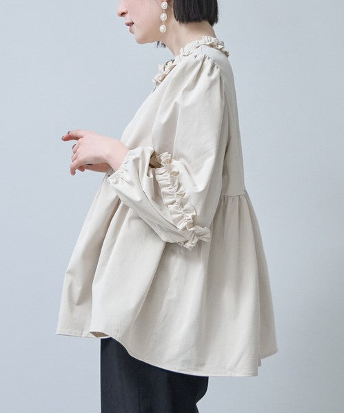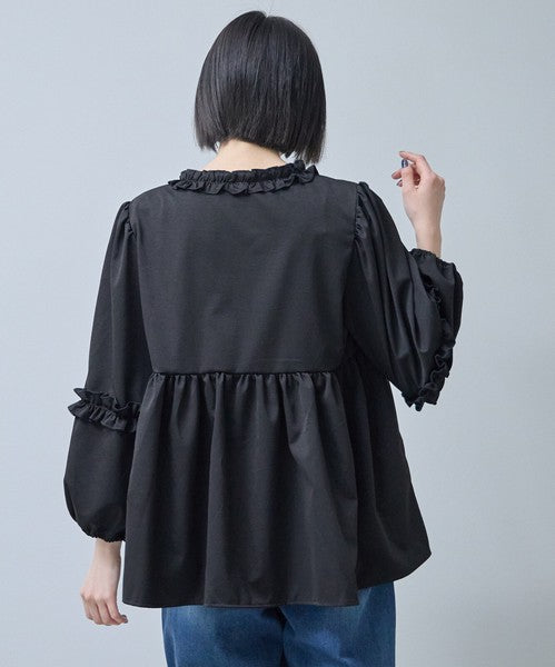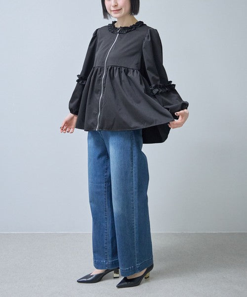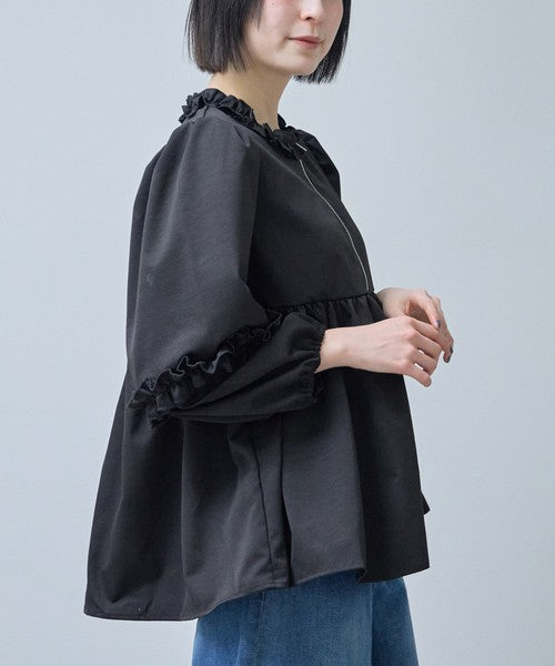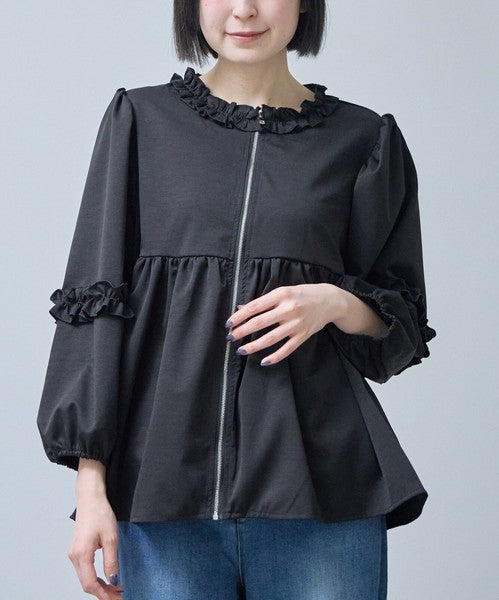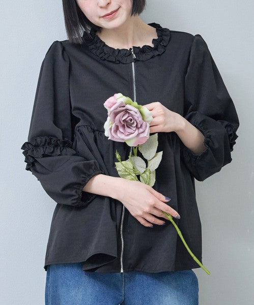 顔周りを華やかに彩る首元のフリルと、袖口に施されたギャザーが、着るだけでドラマチックな印象を演出。 フロントはスッキリとしたジップアップ仕様にすることで、甘さの中に程よいエッジを効かせた、大人のためのガーリースタイルを提案します。