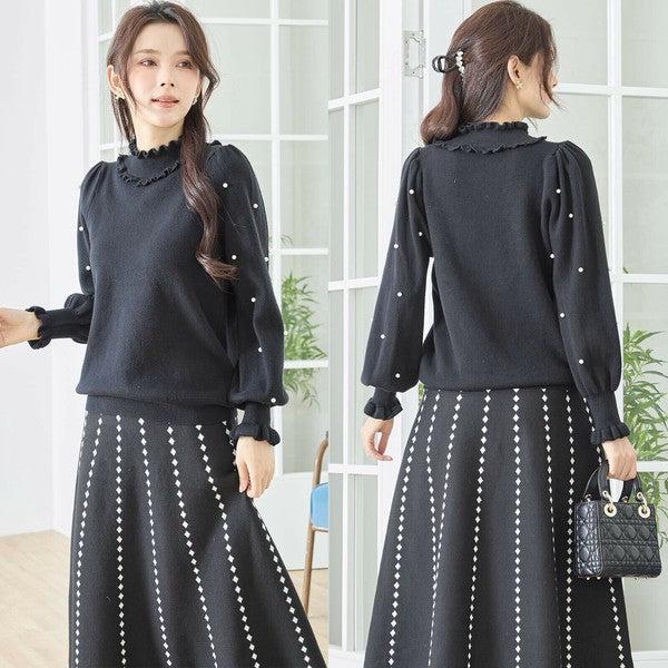 【M〜L】パール付きフリルネックニット|amie studio レディース 秋冬 長袖 セーター エレガント N12-902