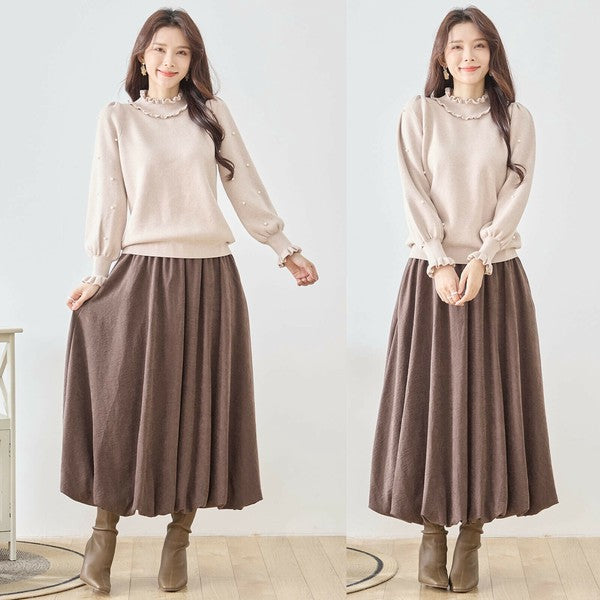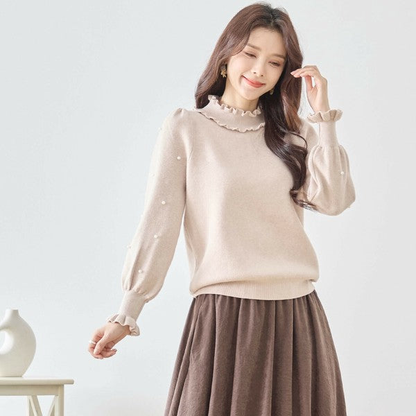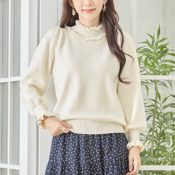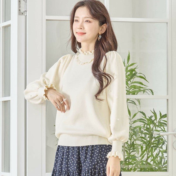 ふんわりとしたパフスリーブにパールを散りばめた、上品でフェミニンな印象のニット。