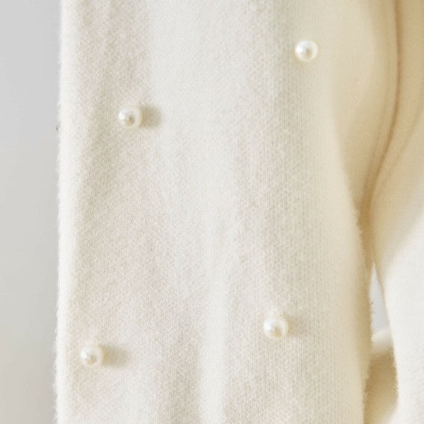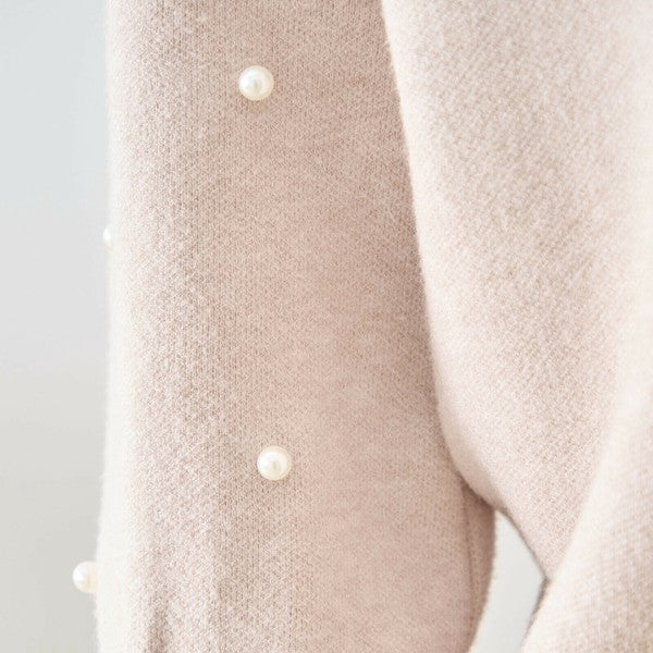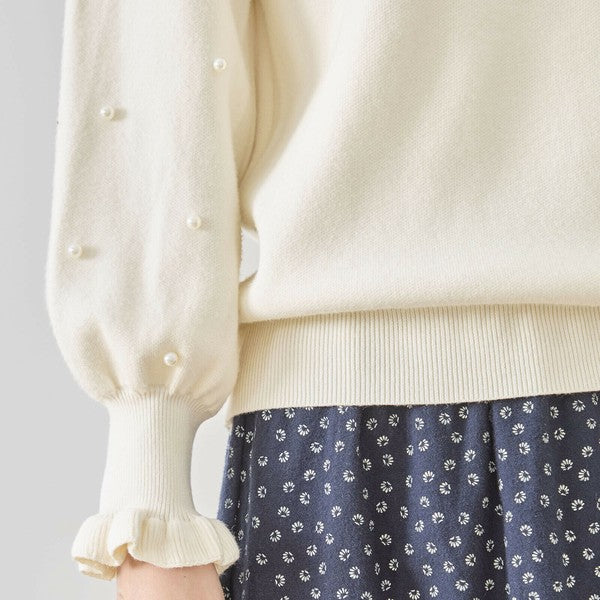 袖にあしらわれた小粒パールが華やかな印象のニットプルオーバー