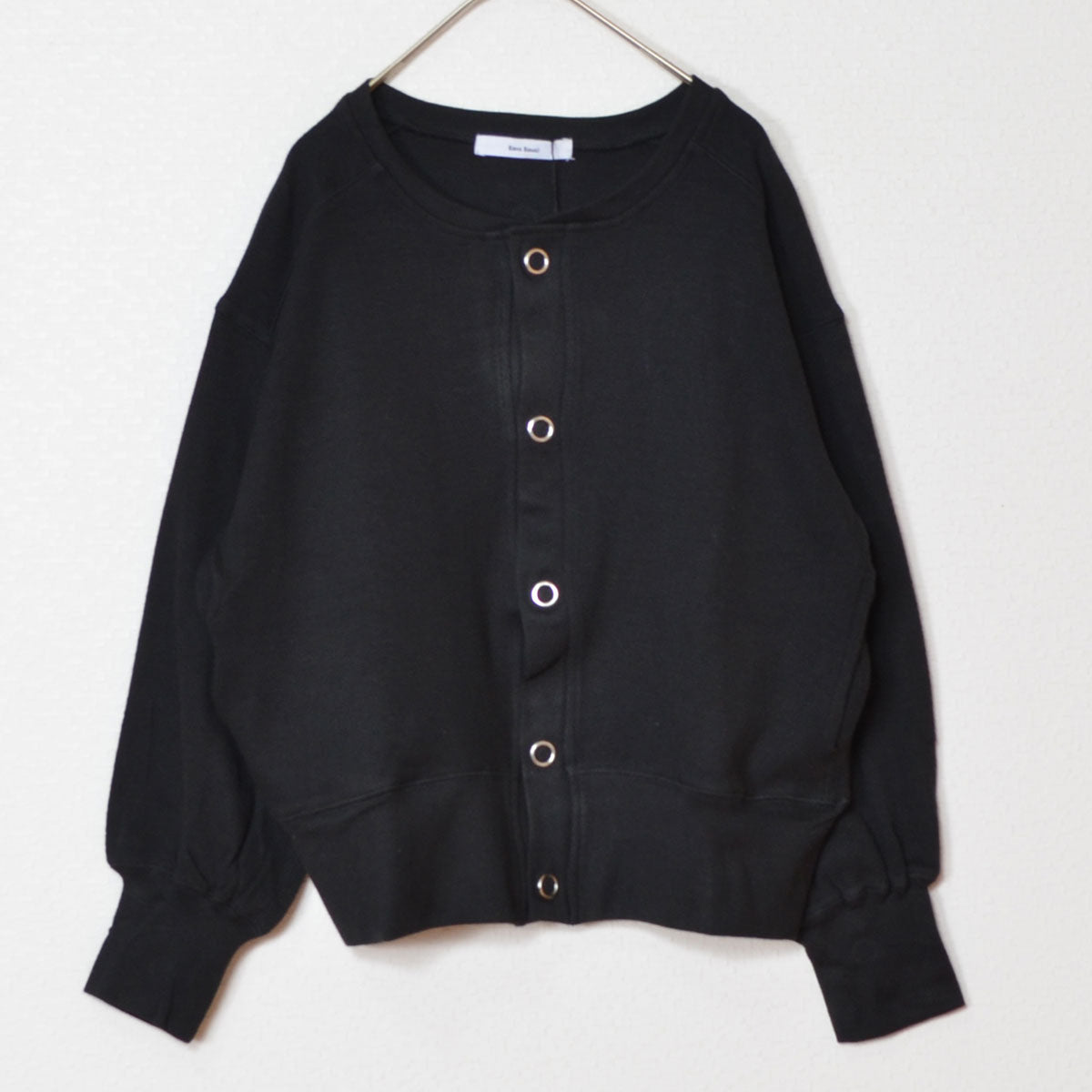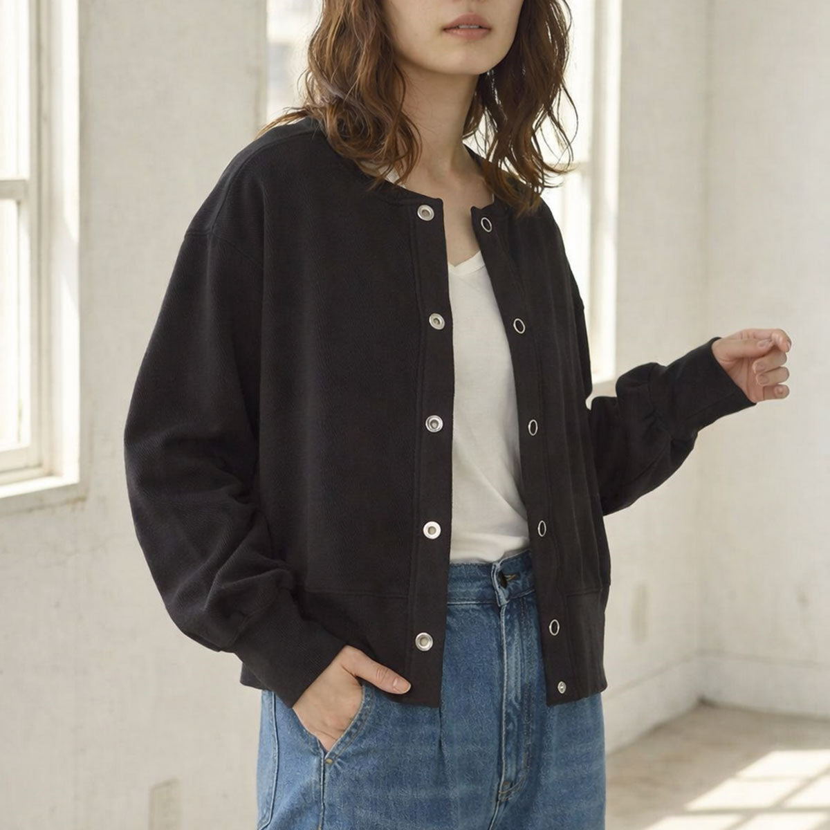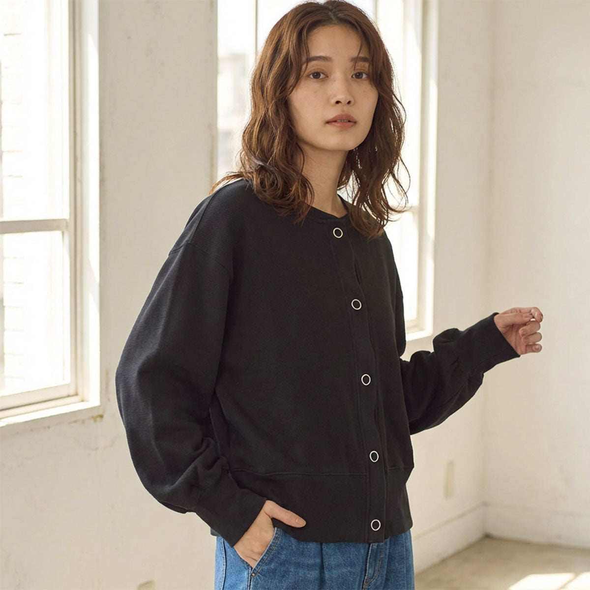 ・アクセントになる「スナップボタン」 フロントは着脱が簡単なシルバーのスナップボタン仕様。カーディガンとしてだけでなく、ボタンを閉めてプルオーバーのように着ても様になります。