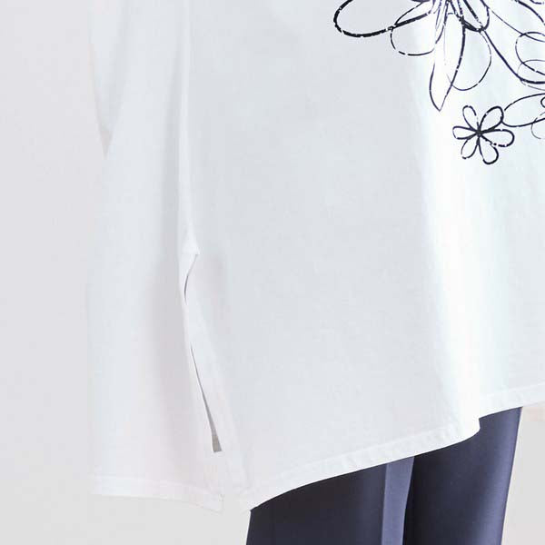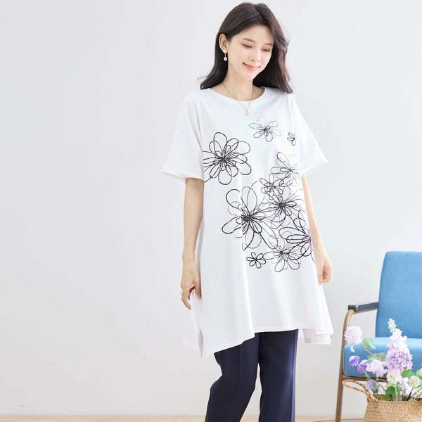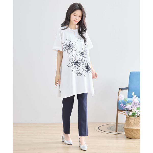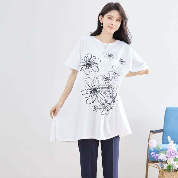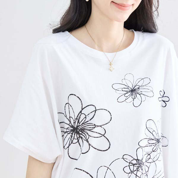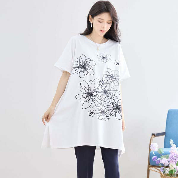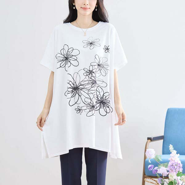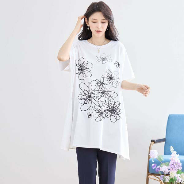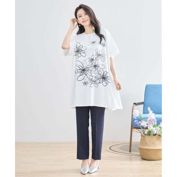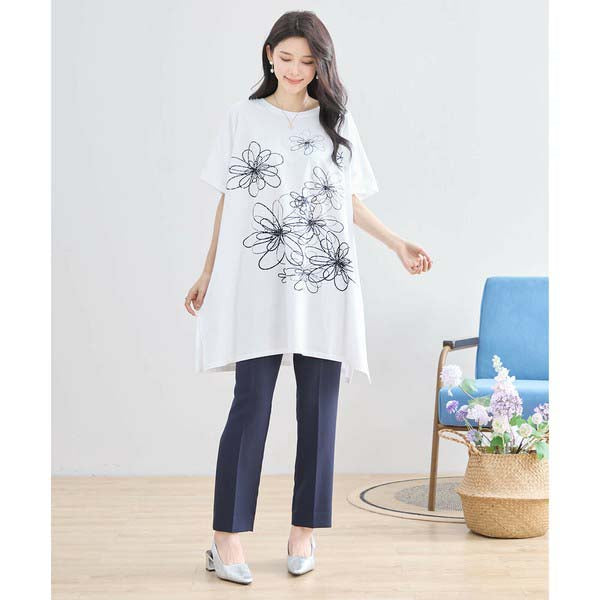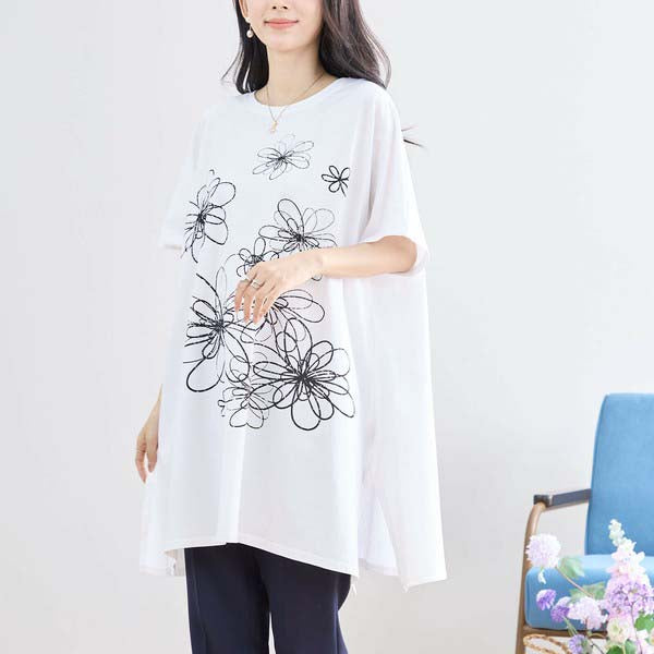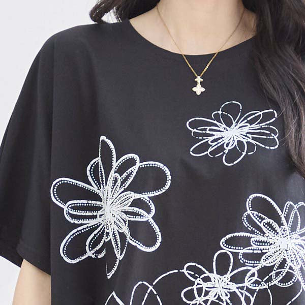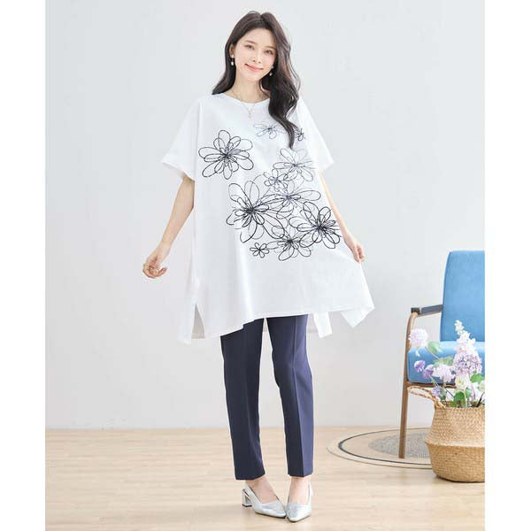 ゆったりとしたシルエットで体型をカバーしながらも、胸元の立体的なフラワーモチーフが上品に輝き、カジュアルコーデをワンランクアップさせてくれる万能トップスです。