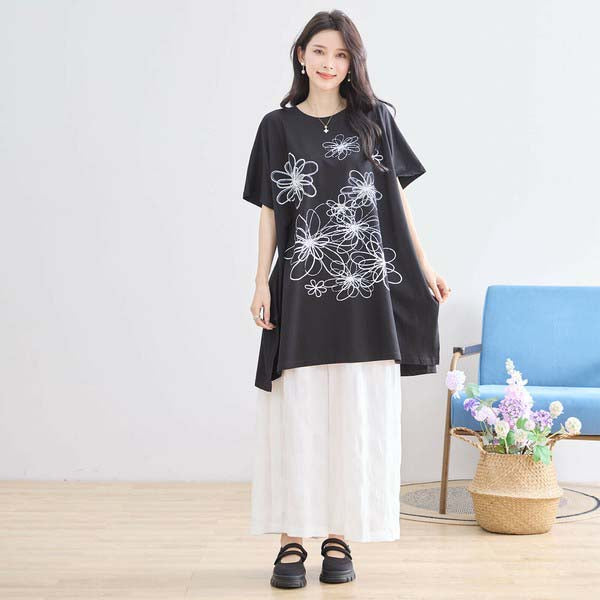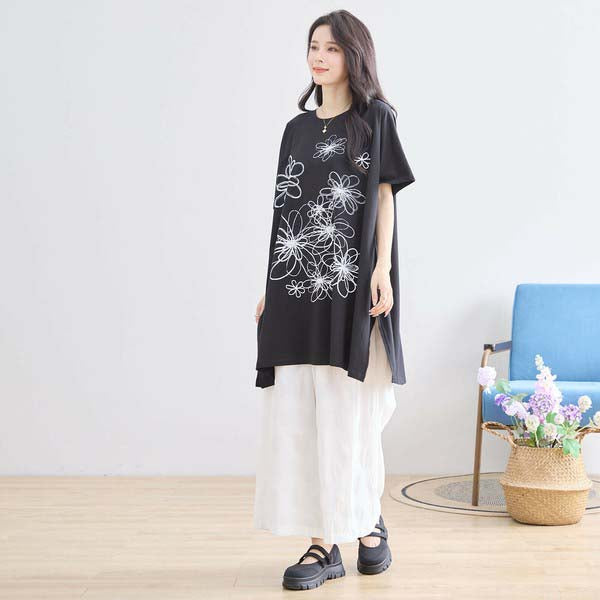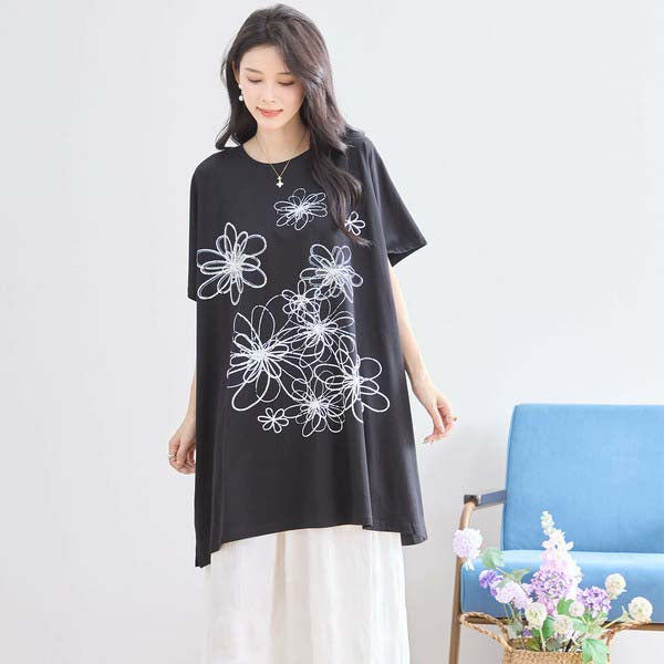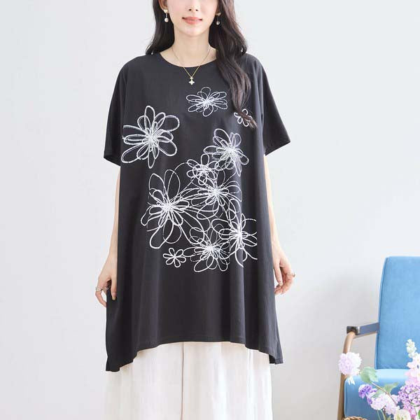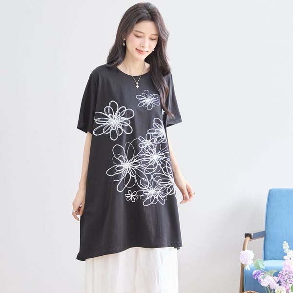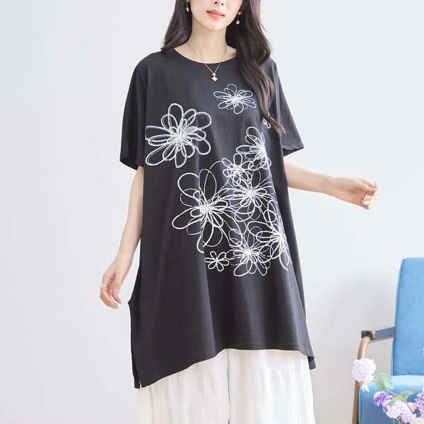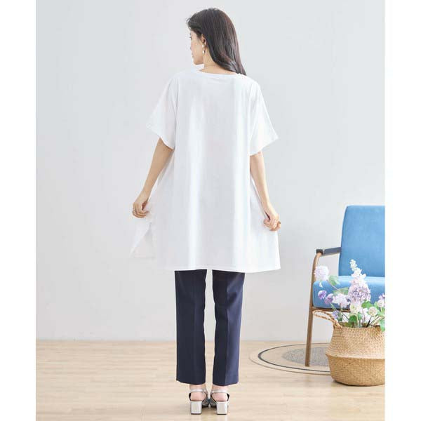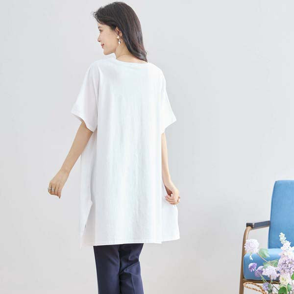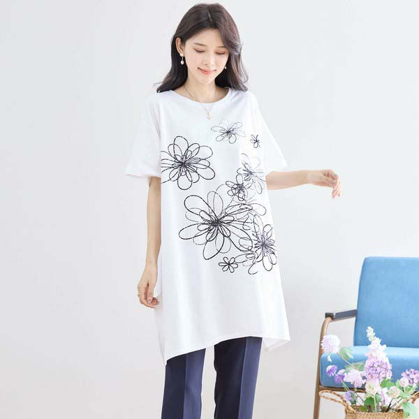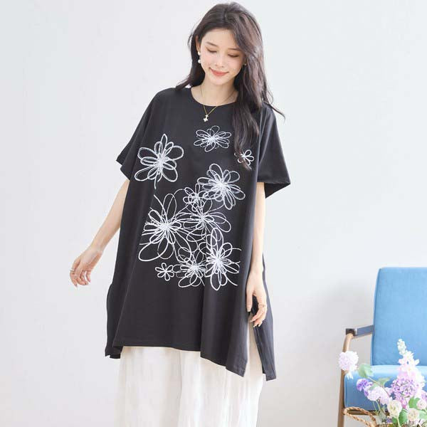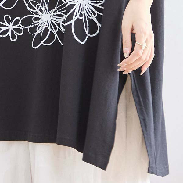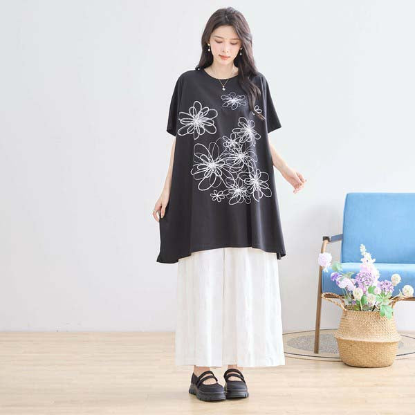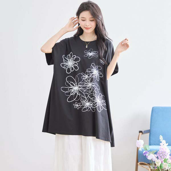 ゆったりとしたシルエットで体型をカバーしながらも、胸元の立体的なフラワーモチーフが上品に輝き、カジュアルコーデをワンランクアップさせてくれる万能トップスです。